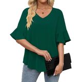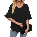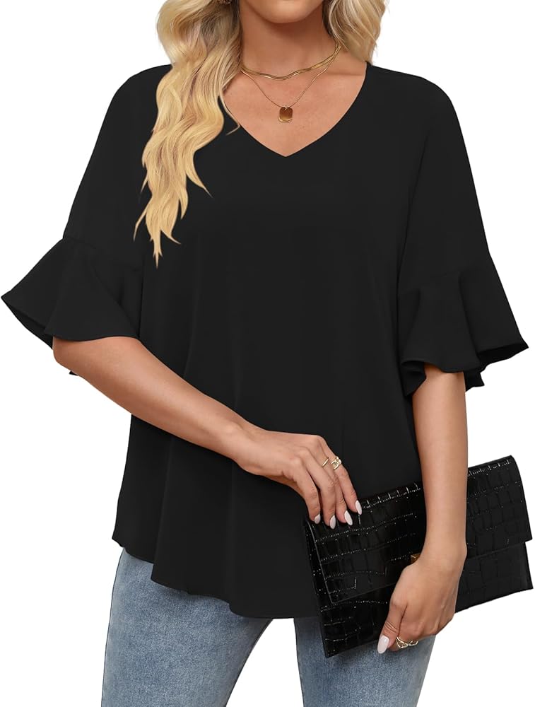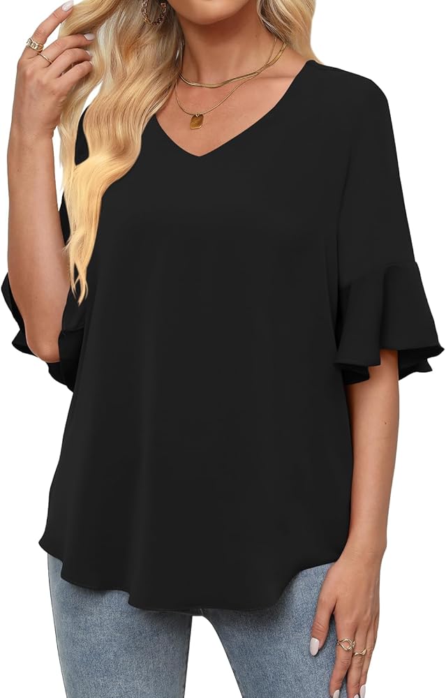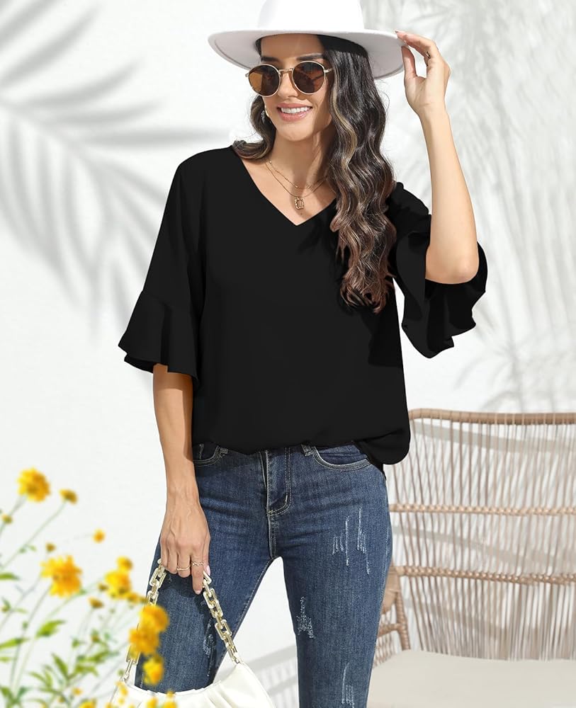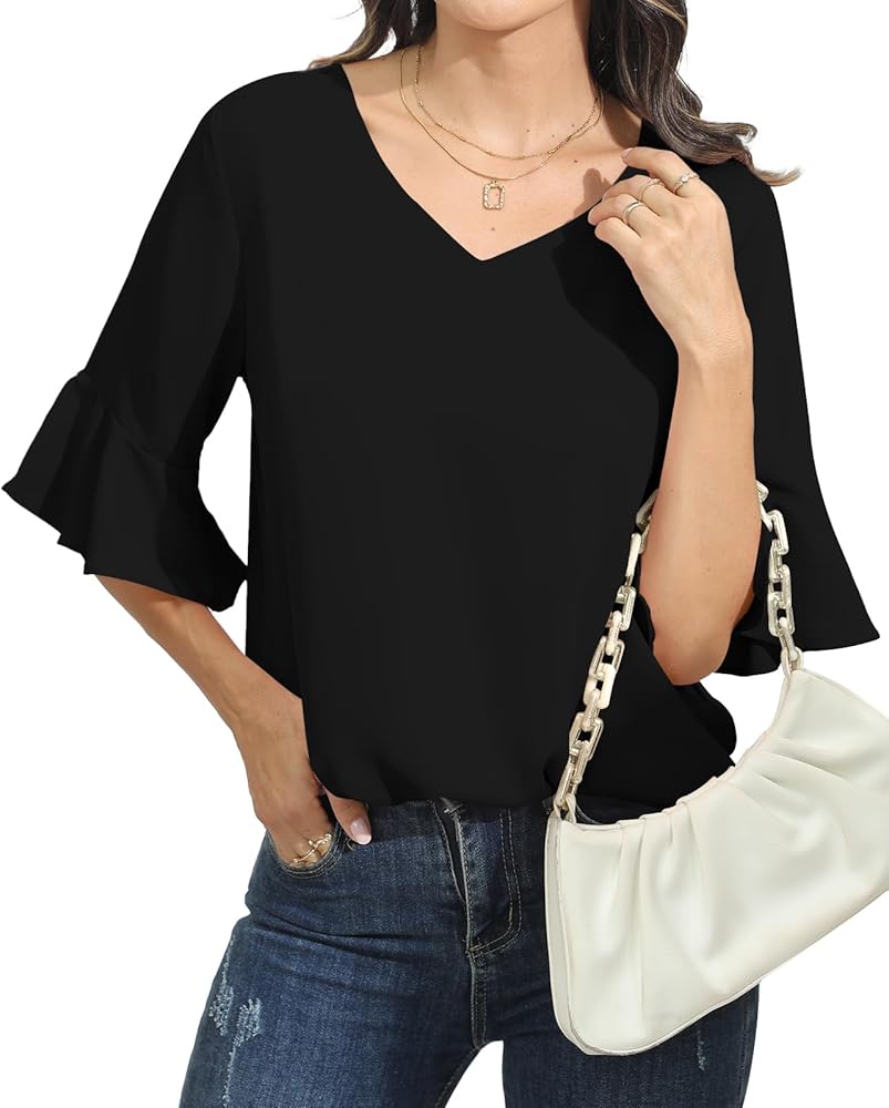 [Designs]: The flared cuffs design can help you look slimmer and show your figure better. This womens dressy casual top features rounded hem, bell sleeves, and a v neck design, easily to dresses up or down.