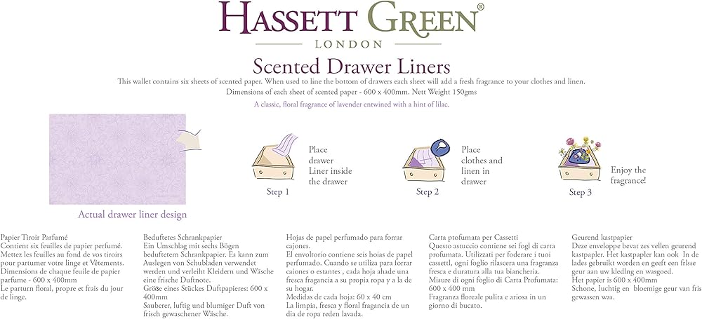 Hassett Green Lilac & Lavender Scented Drawer Liners will add delightful fragrance to your clothes & linen, the scent will freshen your clothes and get rid of unwanted smells from your drawers & cupboards