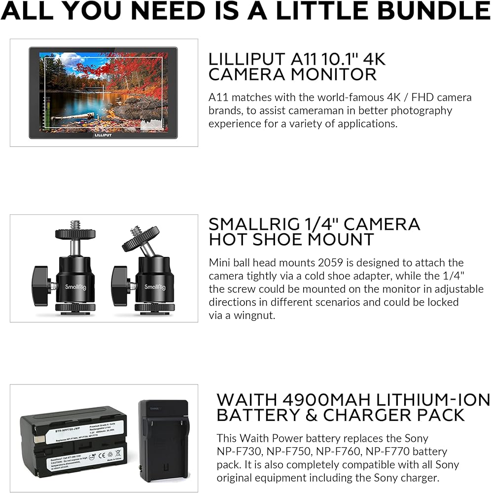 • Bundle Includes: The Lilliput A11 10.1-Inch 4K Portable Monitor Complete with All Standard Supplied Accessories, 1-Year Limited Warranty, +1 Sony L-Series Type Battery Plate, +1 AC Adapter, + SmallRig Camera Hot Shoe Mount 2-pack, +1 Waith Battery and Charger