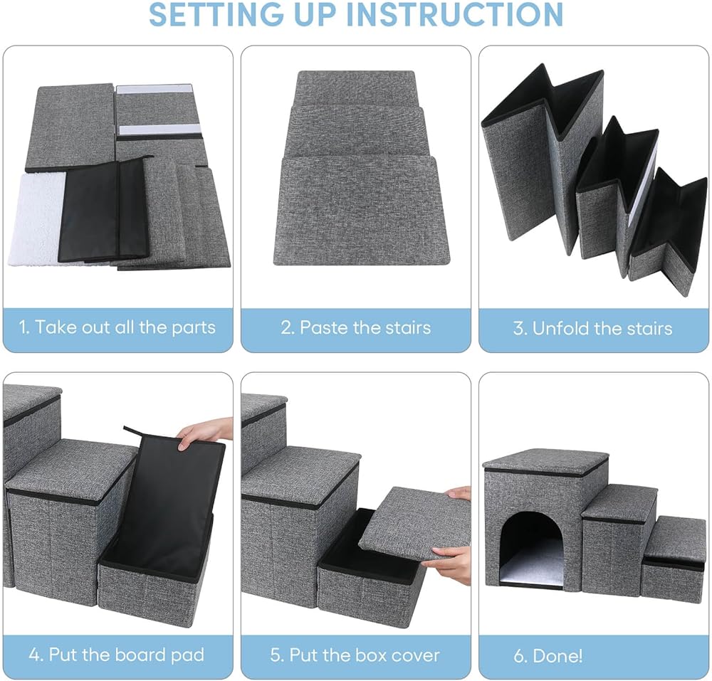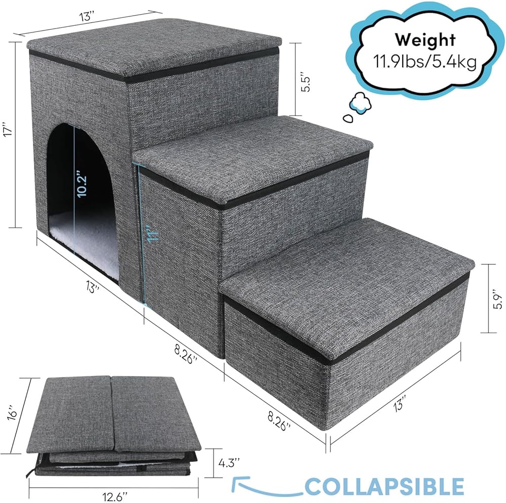 STORAGE & CONDO - Combine the pet stairs, cozy condo and storage space in one. The first 2 steps of this pet steps are designed as a storage box, you can put dog toys, food, clothes or other pet supplies in. The third step can be used as a condo for cats or puppies.