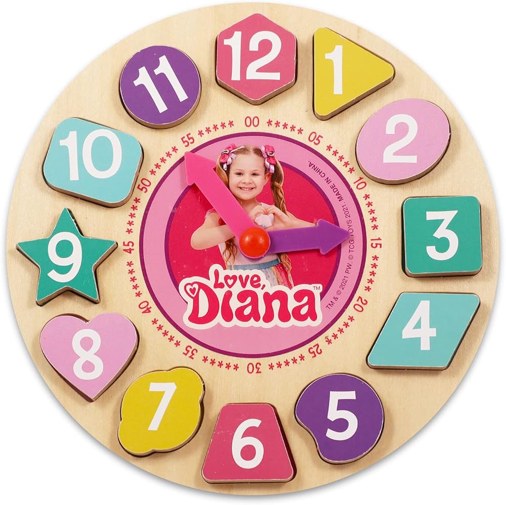 لعبة تصنيف الأشكال على شكل ساعة لاف ديانا للأطفال الصغار، مجموعة ألعاب تعليمية من 5 قطع مع ساعة من لاف ديانا، كتاب تلوين صغير، والمزيد (ألعاب حب ديانا الخشبية)