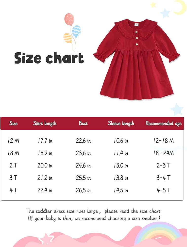 • خمسة مقاسات: مثالي لفساتين الفتيات الصغيرات من 12 إلى 18 شهرًا، وفساتين الفتيات الصغيرات من 18 إلى 24 شهرًا، وفساتين 2t للفتيات الصغيرات، وفساتين 3t للفتيات الصغيرات، وفساتين الأطفال الصغار 4t، وفساتين 5t للفتيات الصغيرات.