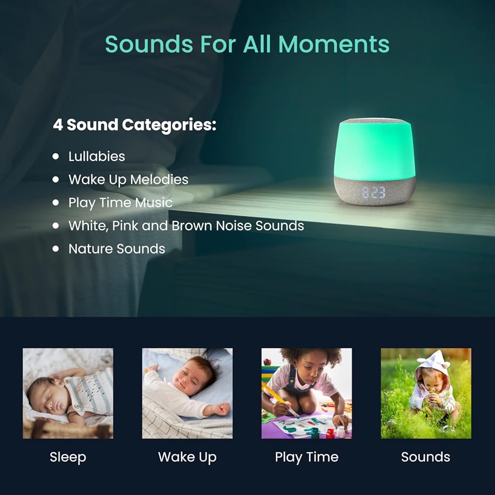 أصوات لجميع اللحظات - 4 فئات صوتية غنية: التهويدات، وألحان الاستيقاظ، وموسيقى وقت التشغيل، وأصوات الضوضاء البيضاء والوردية والبنية، وأصوات الطبيعة.