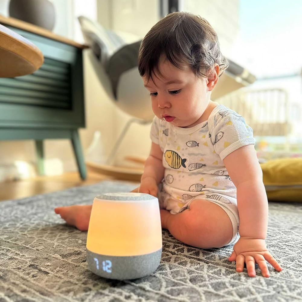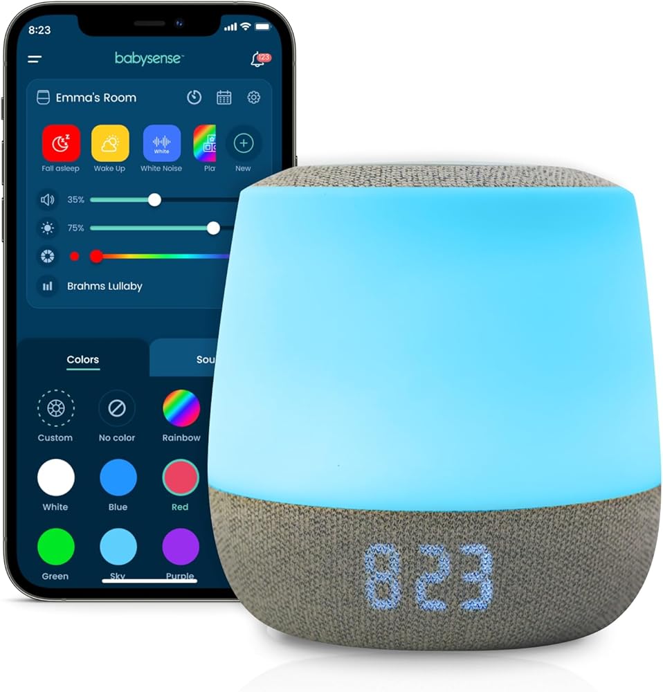 آلة الصوت والضوء من بيبي سينس دريمر للأطفال، إضاءة ليلية RGB قابلة للتعديل، عرض الساعة ودرجة الحرارة، مدرب النوم، جدول البرامج، مهدئ للضوضاء باللون الأبيض والوردي والبني، التهويدات والأصوات