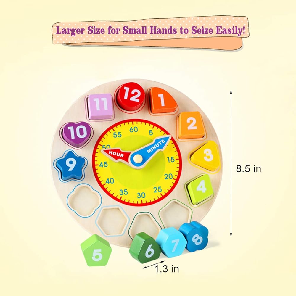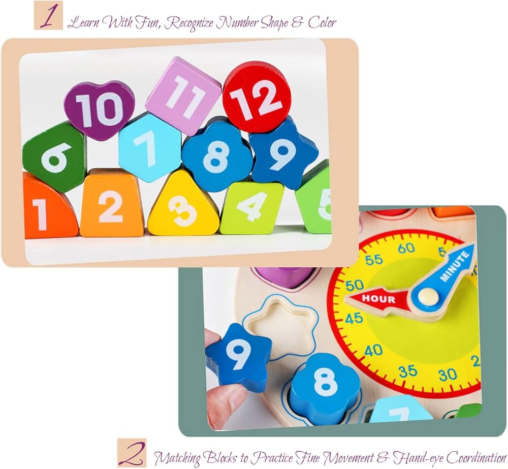 • 【A LEARNING TIME CLOCK】Multi-function in one set, the clock contains minute hand, hour hand and 12 removable variable shaped blocks on which numbered from 1 to 12. A kid can learn how to order and count the number, shape and time from them. Moreover, toddler can get more understanding of math and time setting from moving two hands.