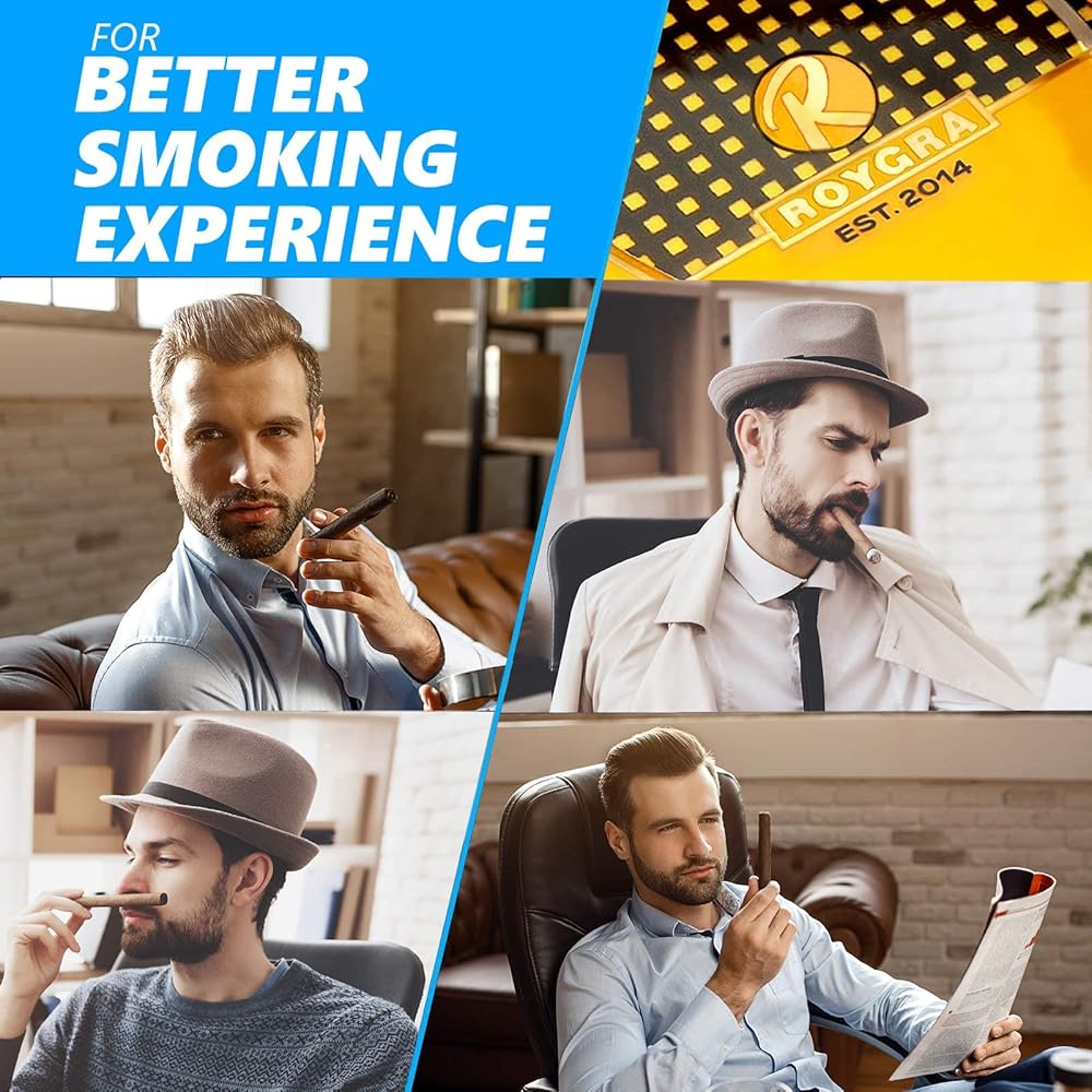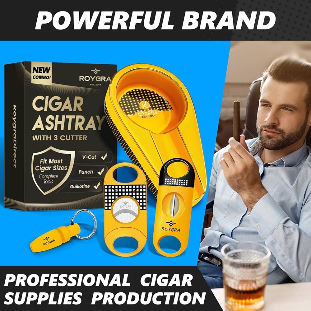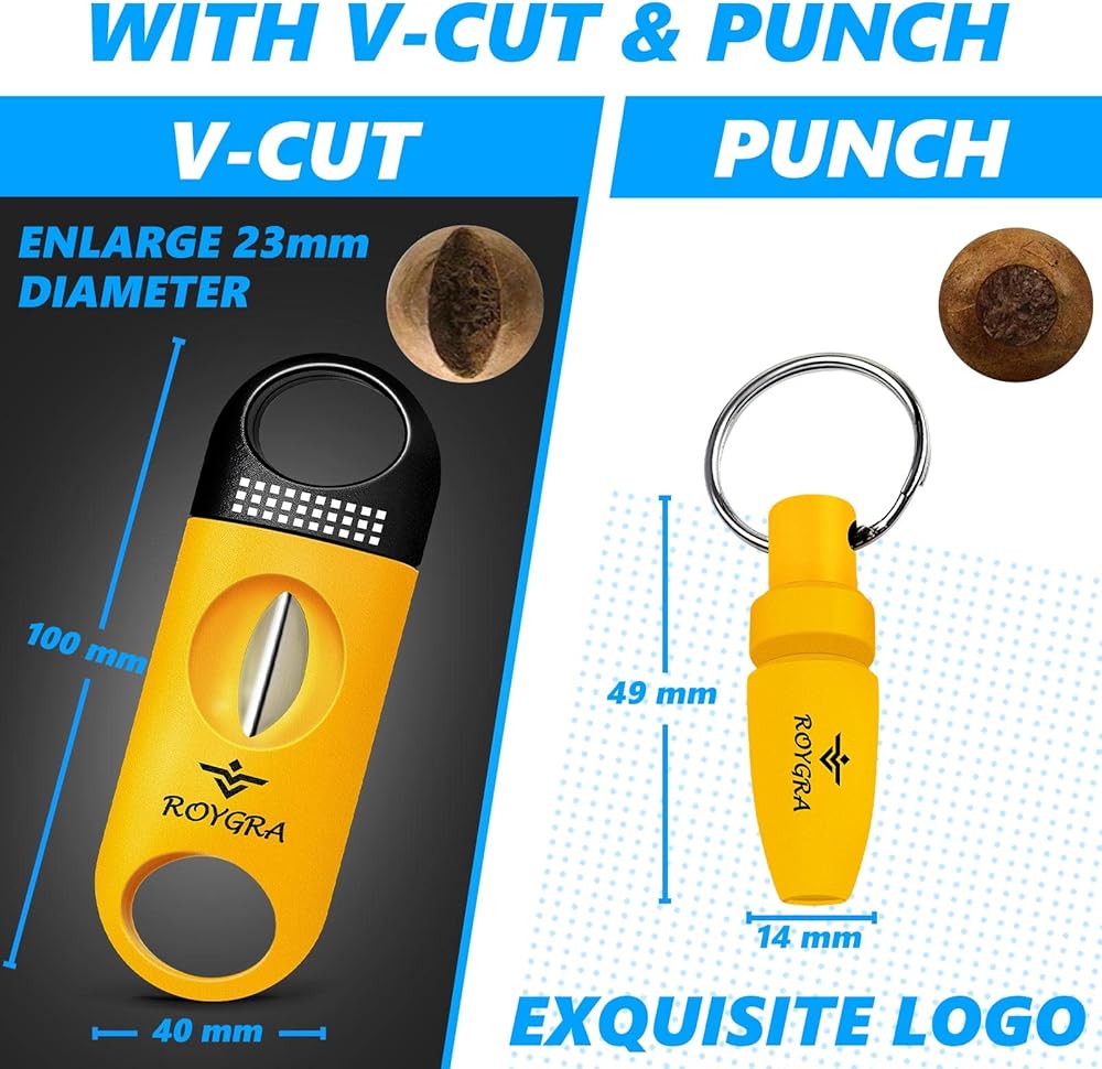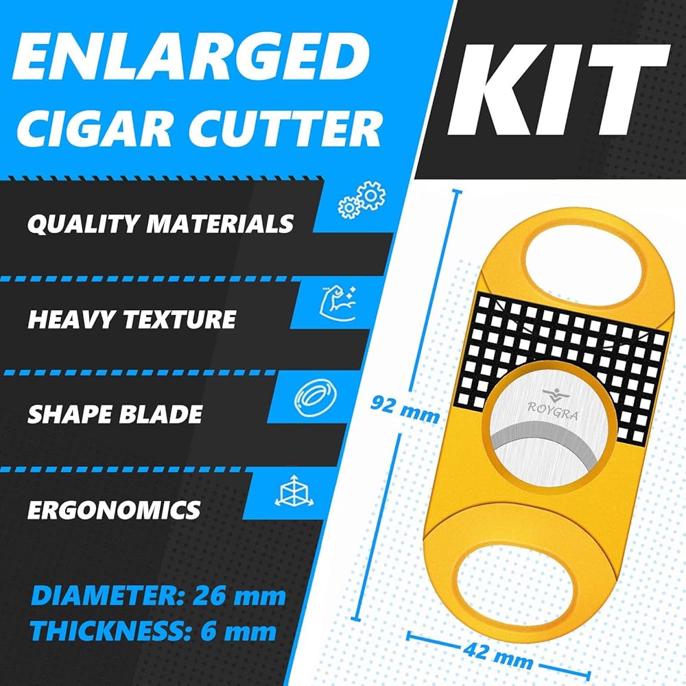 مع مجموعة كاملة من قاطع السيجار، بما في ذلك المقصلة وقطع على شكل حرف V وثقب السيجار.