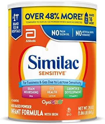 Similac Sensitive* is an easy-to-digest, milk-based infant formula designed for sensitive tummies. It's complete nutrition for fussiness,† gas,† or mild spit-up. Our formula has our exclusive blend of nutrients to help support baby's brain and eye development. Similac was the first leading infant formula brand with no artificial growth hormones‡ and is the #1 infant formula brand fed in hospitals. * Not for infants or children with galactosemia. † Due to lactose sensitivity. ‡ No significant difference has been shown between milk derived from rbST-treated and non-rbST-treated cows.