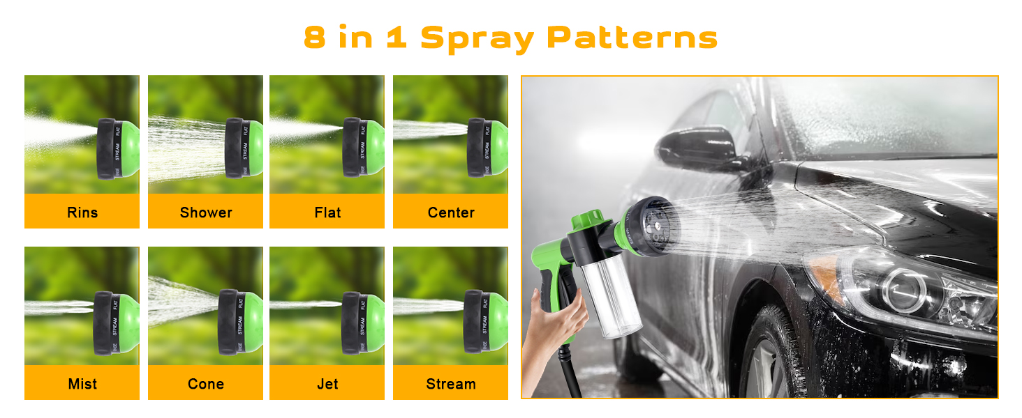 【8 in 1 Spray Patterns】The foam sprayer gun has 8 types of nozzles, rotate click spray selector for different settings (Mist, cone, flush, stream, angled, shower, flat, center), which can bathe your pets,wash your car, water lawns, plants, gardens, fit your different needs.