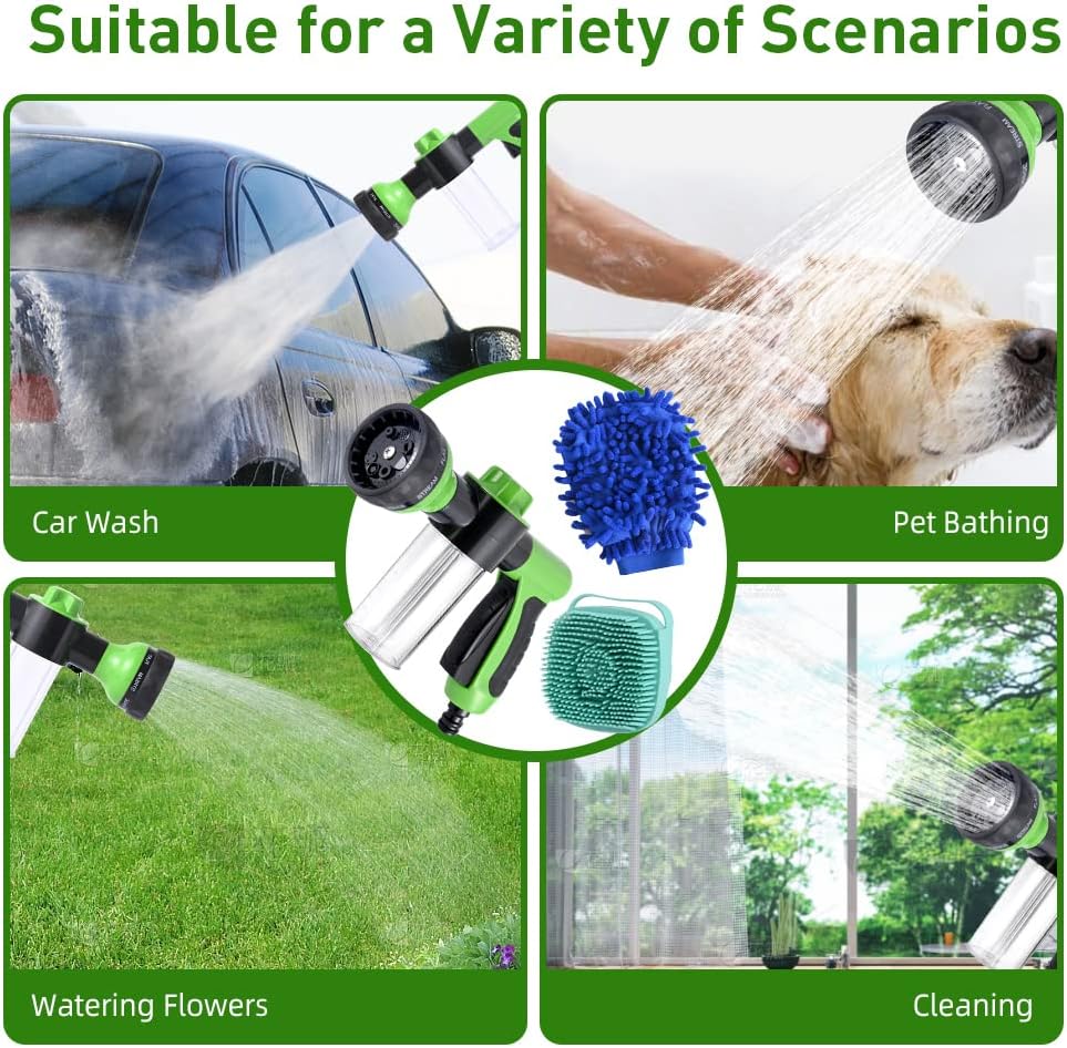 【You Will Get】1 x hose nozzle sprayer with soap dispenser; 4 x different faucet connections;1 x Car Wash Mitt; 1 x Silicone Pet Bathing Brush.
