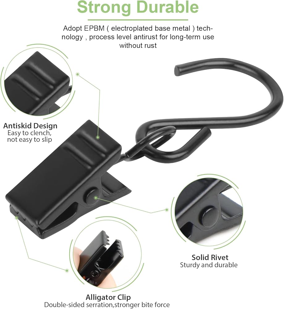 【WIDLY USED】The curtain clip is suitable for hanging shower curtains, drapes, LED lights, photos, cloth, lamps, etc.It can be used in office, hotel, restaurant, bedroom, bathroom, kitchen, garden, etc.