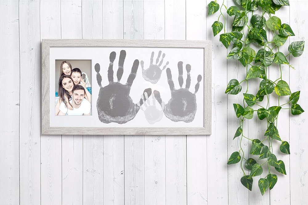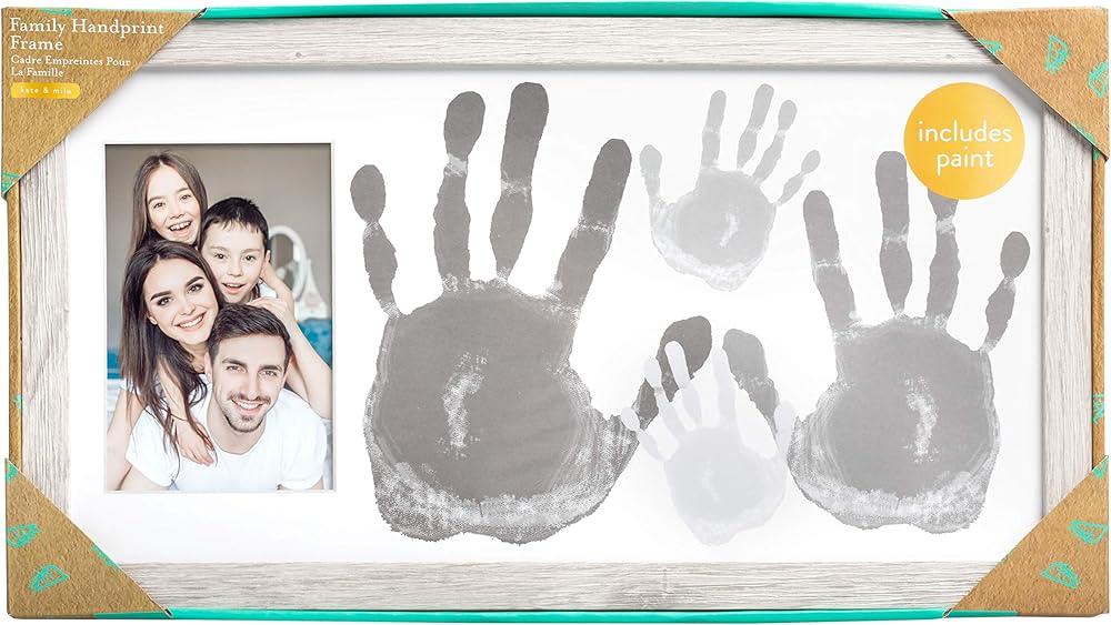 Looking for a unique gift the whole family will enjoy? Kate & Milo's Rustic Family Handprint Frame is a great baby shower gift or new parent gift that is also perfect for Mother's Day, Father's Day, or a child's birthday! In addition to a beautiful, rustic picture frame, you're giving the gift of quality time and a fun family bonding activity with this unique family craft. This lovely frame comes with an easy-to-use handprint kit complete with four packets of non-toxic paint in different shades of gray and cardboard matting ready for mommy, daddy, and their little ones' handprints along with a favorite family photo. A perfect craft for the whole family that's sure to bring everyone closer together, whether it's new parents and baby or older siblings bonding with a new baby brother or sister. At the end of family night, they'll have the treasured memories of working together to create this fun DIY keepsake craft, along with a one-of-a-kind keepsake to hang in their home. The whole family, along with everyone who visits, will love looking at this adorable customized wall art, and as the little ones grow up, they'll love seeing just how tiny their hands once were! Dimensions: 9.5" H x 17" W x .5" D // Photo insert: 6" H x 4" W