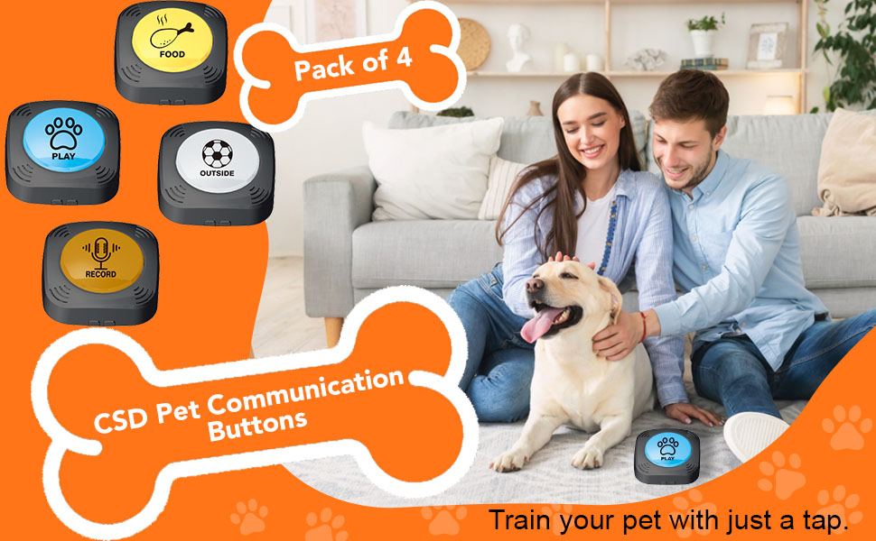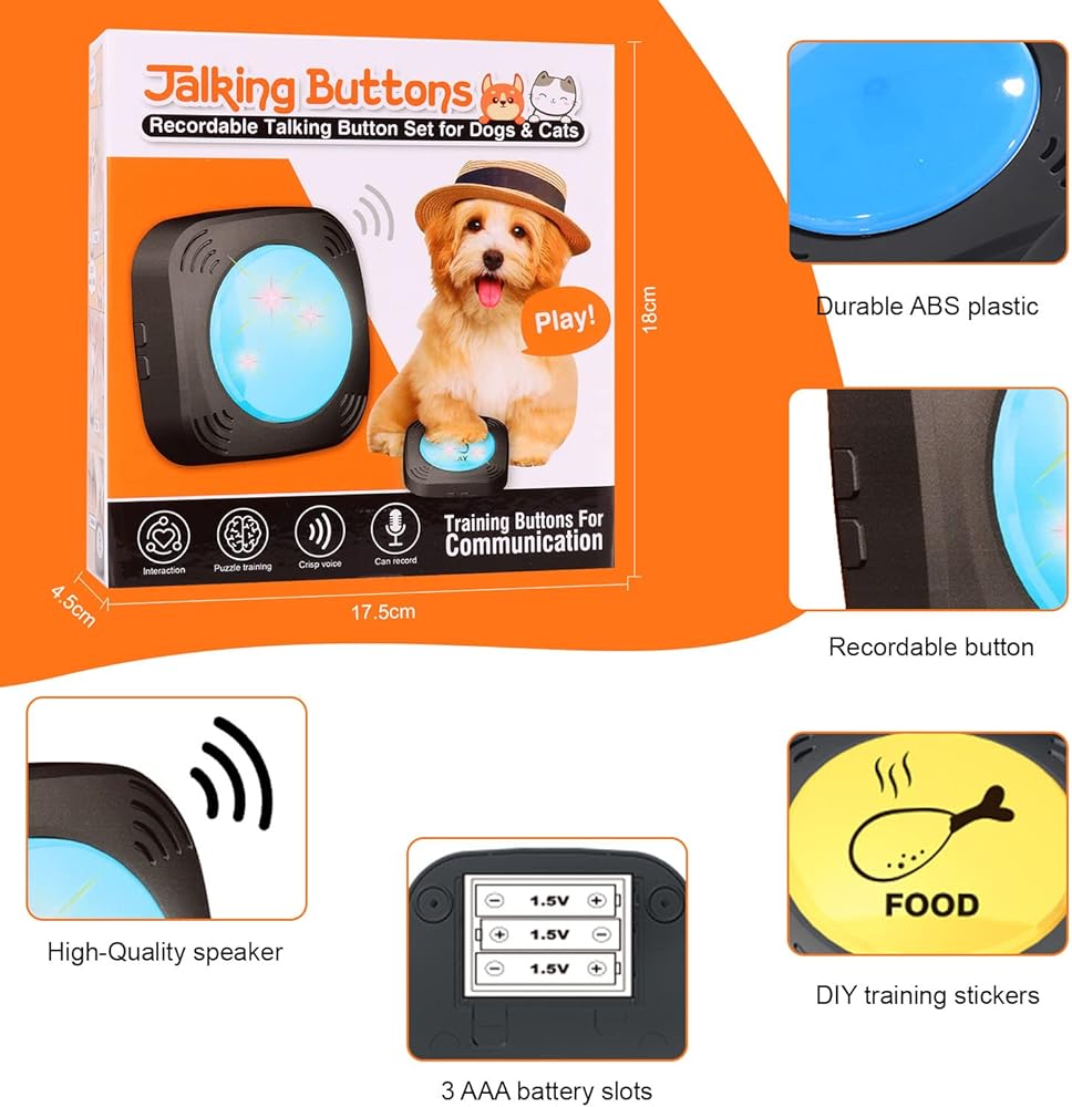 - التدريب الصوتي والبصري: تعمل أزرار الأوامر الصوتية للكلاب كأدوات تدريب صوتية ومرئية. تعمل بالبطارية ايه ايه ايه (البطاريات غير متضمنة) وتتميز بجيب بطارية آمن للحيوانات الأليفة لمنع البلع العرضي للأجزاء الصغيرة.