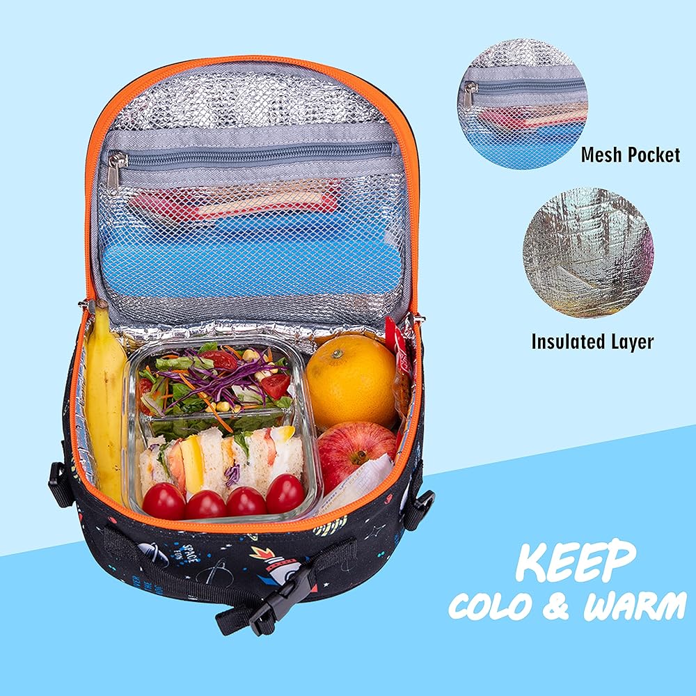 • سهلة الحمل - خفيفة الوزن، ومحمولة، وحقيبة الغداء للأطفال تناسب حاوية ذات حجم جيد، والوجبات الخفيفة، وأدوات المائدة وما إلى ذلك. تتميز بجيب خلفي بسحاب لإخفاء الأشياء الصغيرة، وحقيبة شبكية داخلية مثالية للمناديل أو الثلج المعبأ.