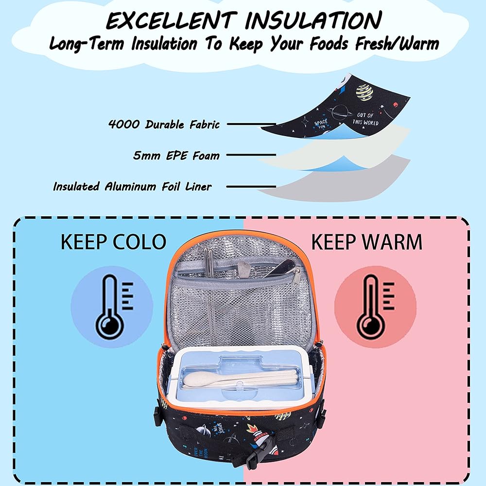 • ترقية المواد: 4 ساعات عندما تكون ساخنة و8 ساعات عندما تكون باردة. تأتي حقيبة الغداء للأطفال مع نسيج بوليستر متين، وإسفنج البولي إيثيلين الموسع (EPE)، وعزل أسيتات فينيل البولي إيثيلين (PEVA). اختيار جيد للحفاظ على حقيبة غداء طفلك المحبوبة معزولة جيدًا. تأكد من أنهم يتناولون غداءهم بارتياح كبير. دع أطفالك أو بناتك يستمتعون بوقت الوجبة من صندوق الغداء اللطيف هذا.