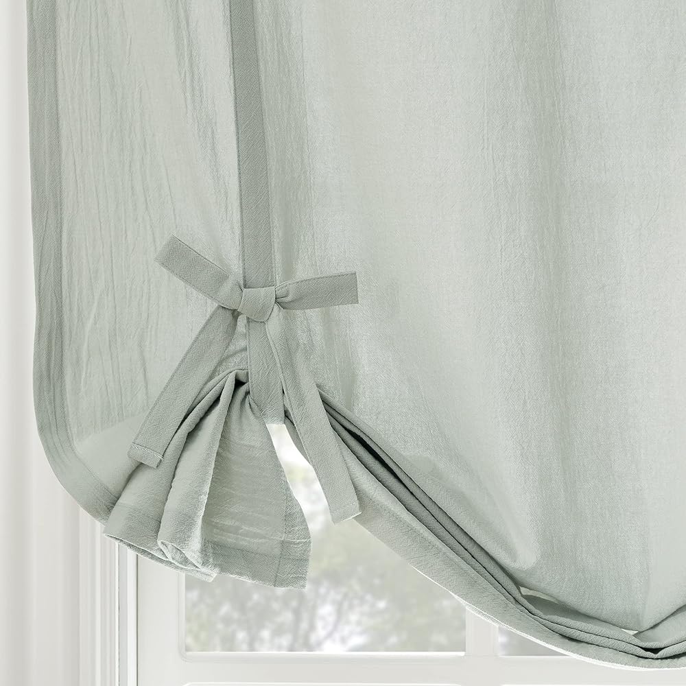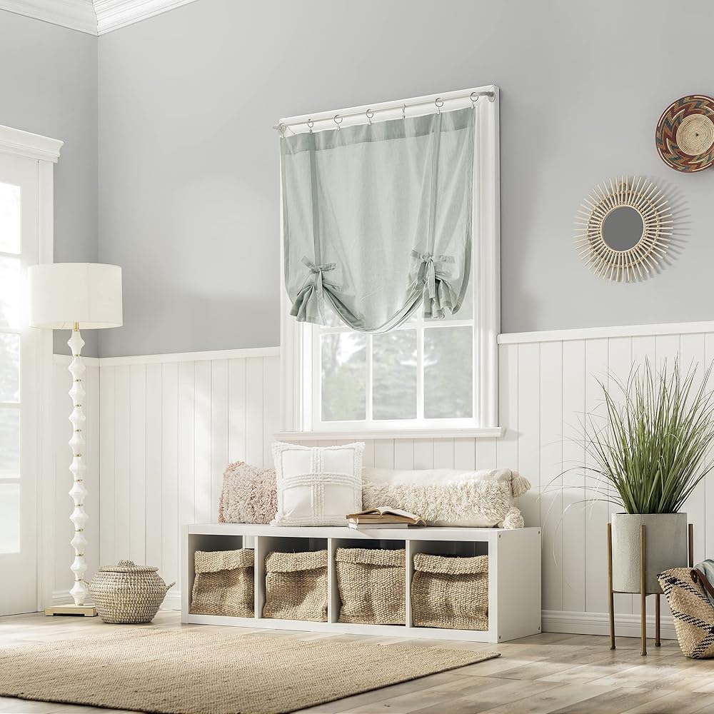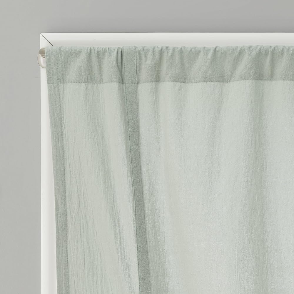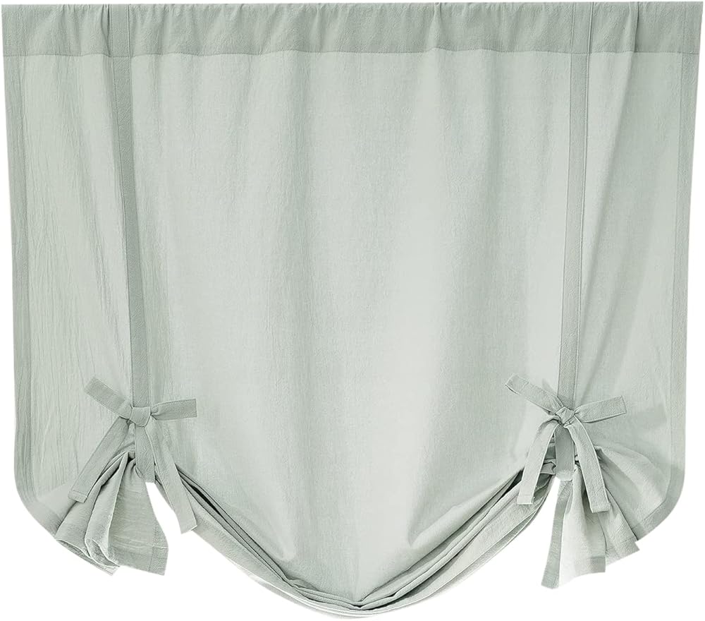 This handsome cotton curtain is a classic good look. Window Tie-up Shade s from Archaeo adds personality to any window with a tie-up feature. Ideal for kitchens, bathrooms and other smaller windows, these washed texture semi-sheer 100% cotton cafe curtains gently filter light while enhancing privacy. Rod Pocket design allows for simple slide-through installation on curtain rods up to 1 ½" in diameter. Sold as individual panels measuring 42" width by 63" length in color seafoam green. Measure carefully before selecting your desired size and quantity. Rod not included. Machine wash cold on gentle cycle. Use non-chlorine bleach when needed. Tumble dry on low heat, using a cool iron as needed.