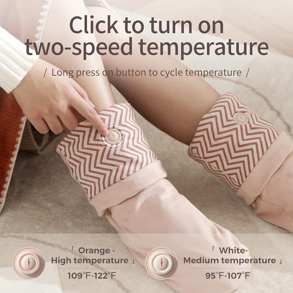 • 🧦🔥🦶【2 Heat Settings To Keep Your Feet Warm】The heated socks have two heat settings that you can adjust to the right temperature as needed. The orange button is for high temperature (109℉-122℉) which lasts about 4 hours, and the white button is for medium temperature (95℉-107℉) which lasts about 6 hours. Both temperatures provide you with a warm and comfortable experience.