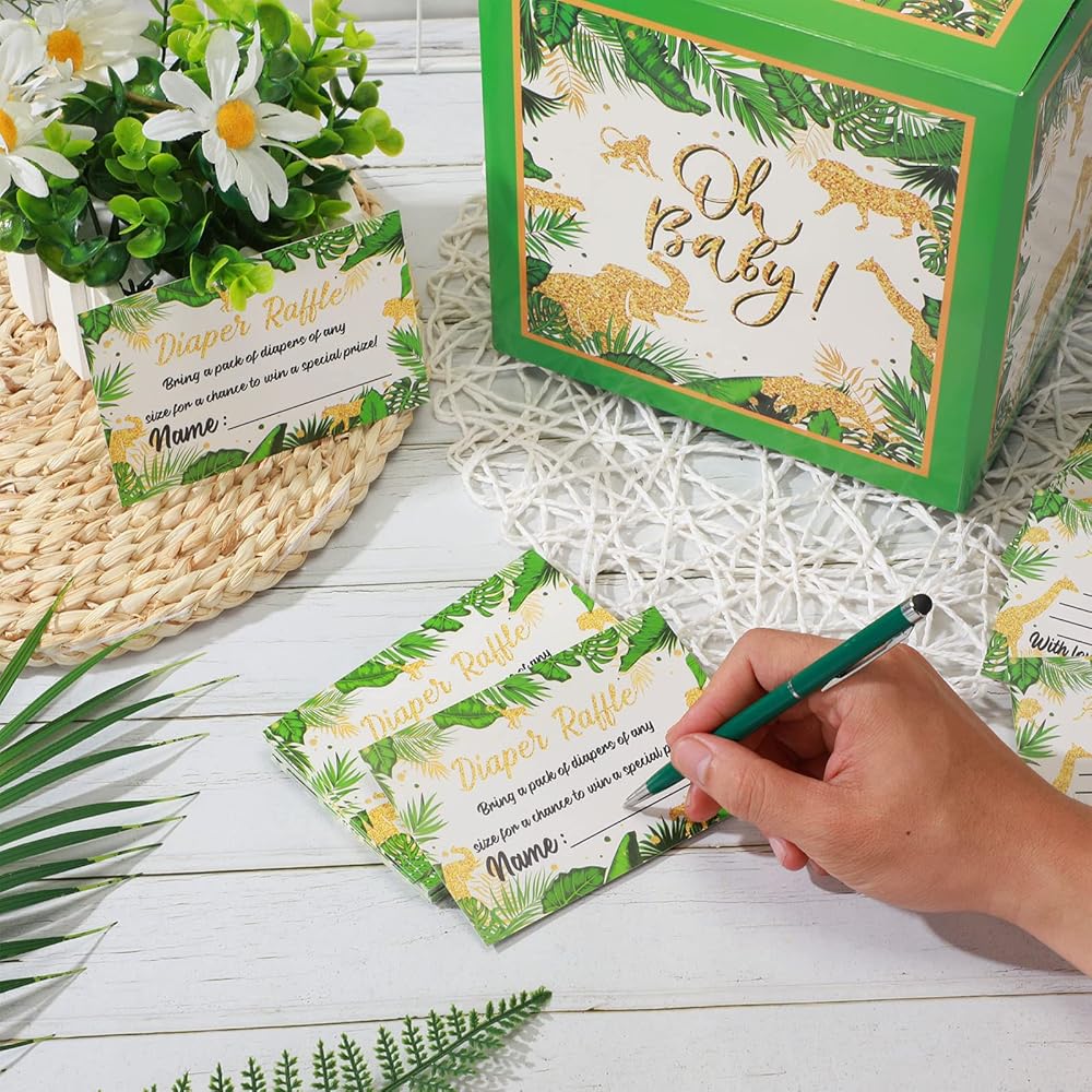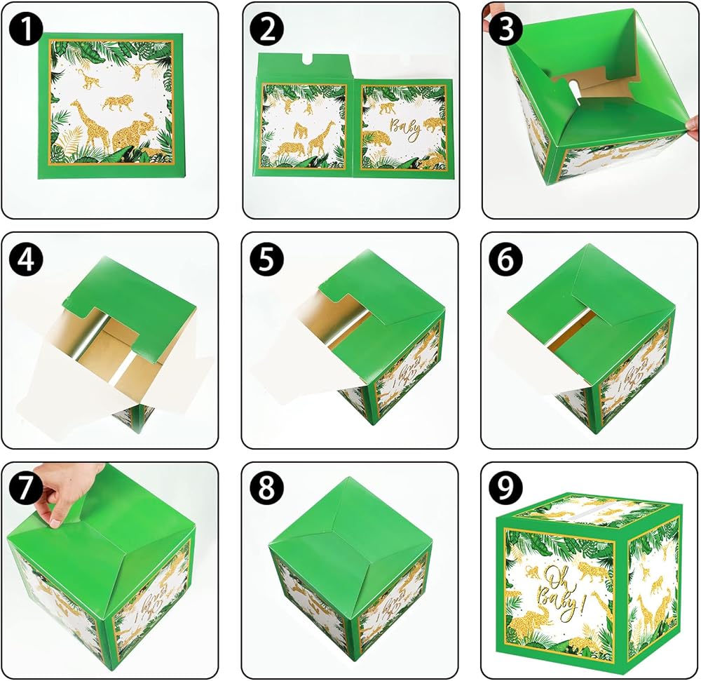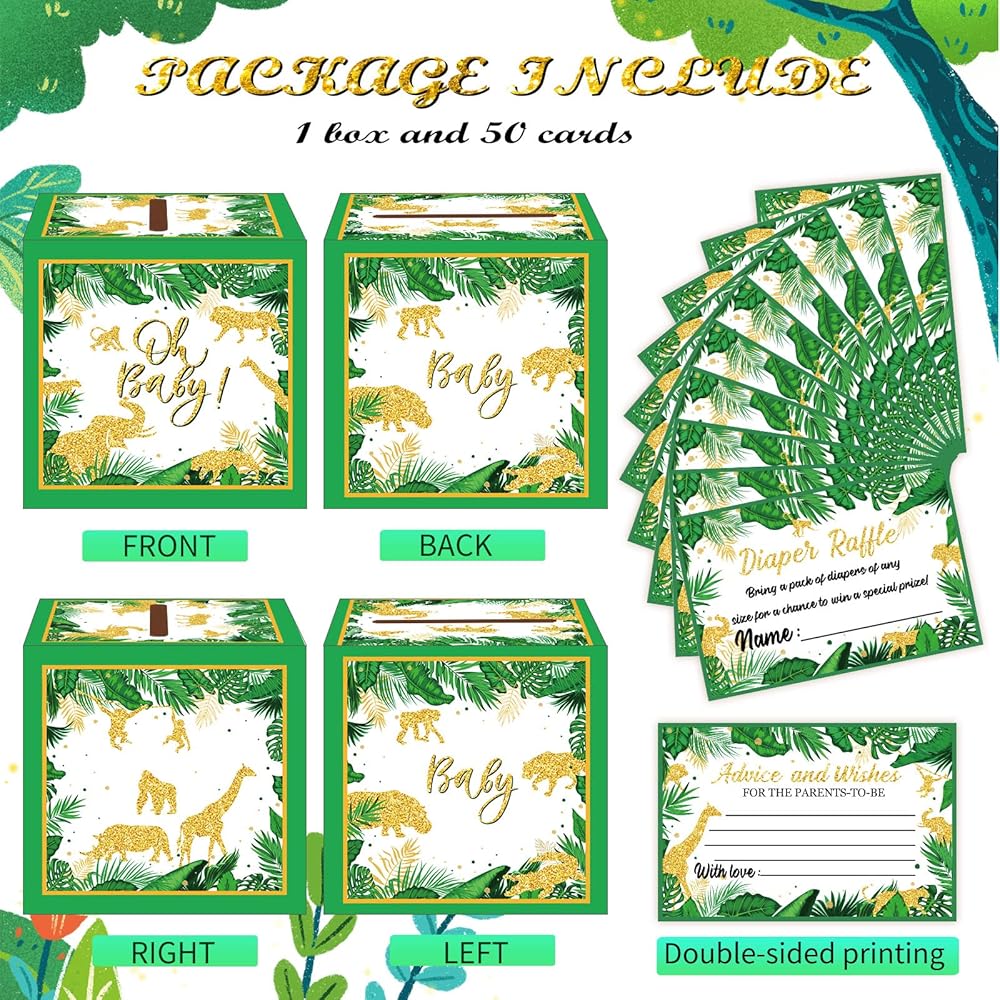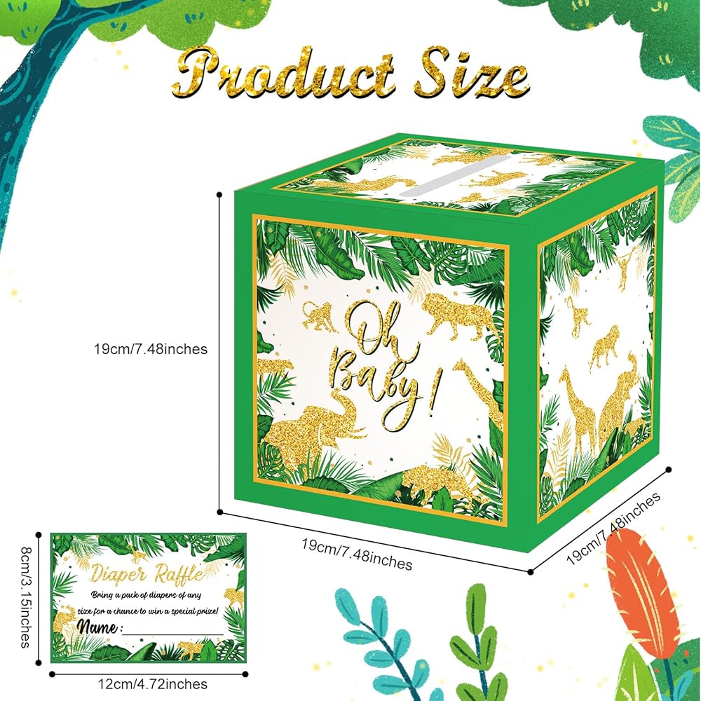 صندوق بطاقات سحب حفاضات سفاري جانجل ومجموعة البطاقات رقيقة ومناسبة للأصدقاء وأفراد العائلة لإظهار نصائحهم وتحياتهم في حفلات استقبال المولود. صندوق البطاقات مناسب أيضًا لتخزين التذكارات والصور وبطاقات المعايدة من هذا الحدث الذي لا ينسى.