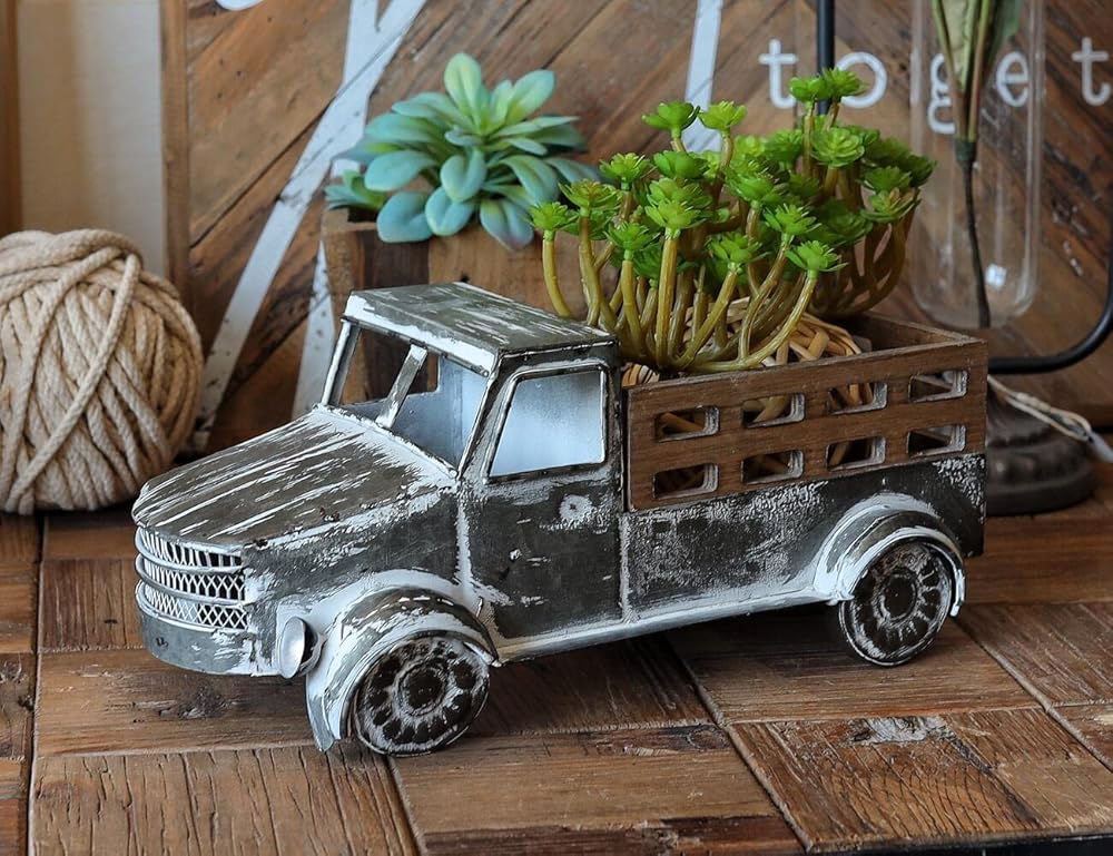 This collectable vintage antique gray metal truck features a classic farmhouse car model. It is a perfect gift for holidays, car enthusiast, for your relatives and friends!Give your space a touch of classic style that will bring the nostalgia to life by adding small plants or succulents to the bed of the truck. This vintage antique gray truck can be used as decorative tabletop storage, gift basket and so on.This farmhouse vintage truck is perfect to use as year-round decor which is a classic country accent for your home, perfect spring decor & garden decorations. This turquoise metal truck looks great in the kitchen, living room, bookshelves, mantel and anywhere that needs a touch of nostalgia