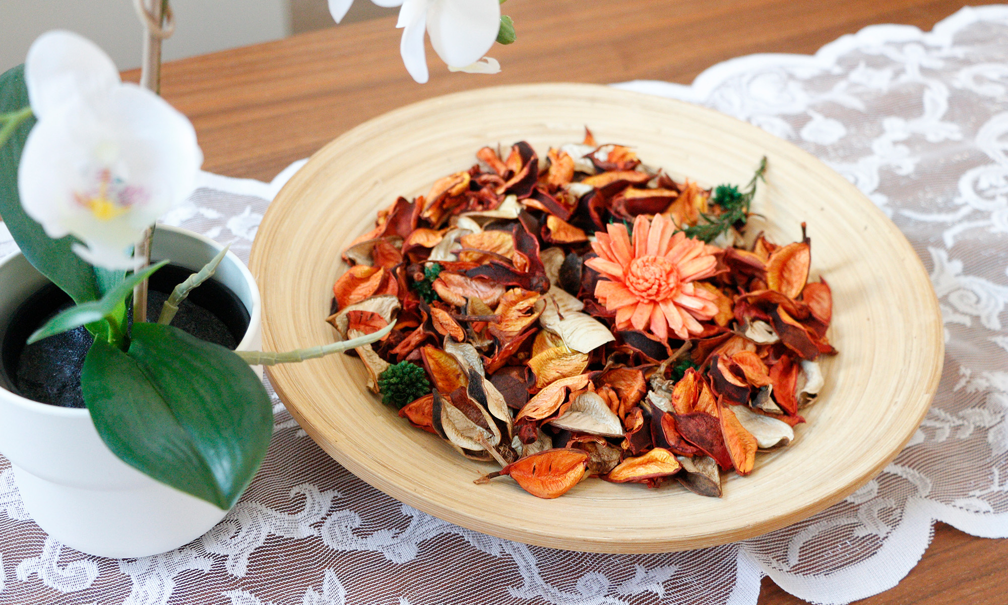 1. حشو وعاء مجففات الخريف: كيس مجففات 5 اونصة، مفرش طاولة من الدانتيل، قارورة عطر متضمنة