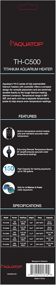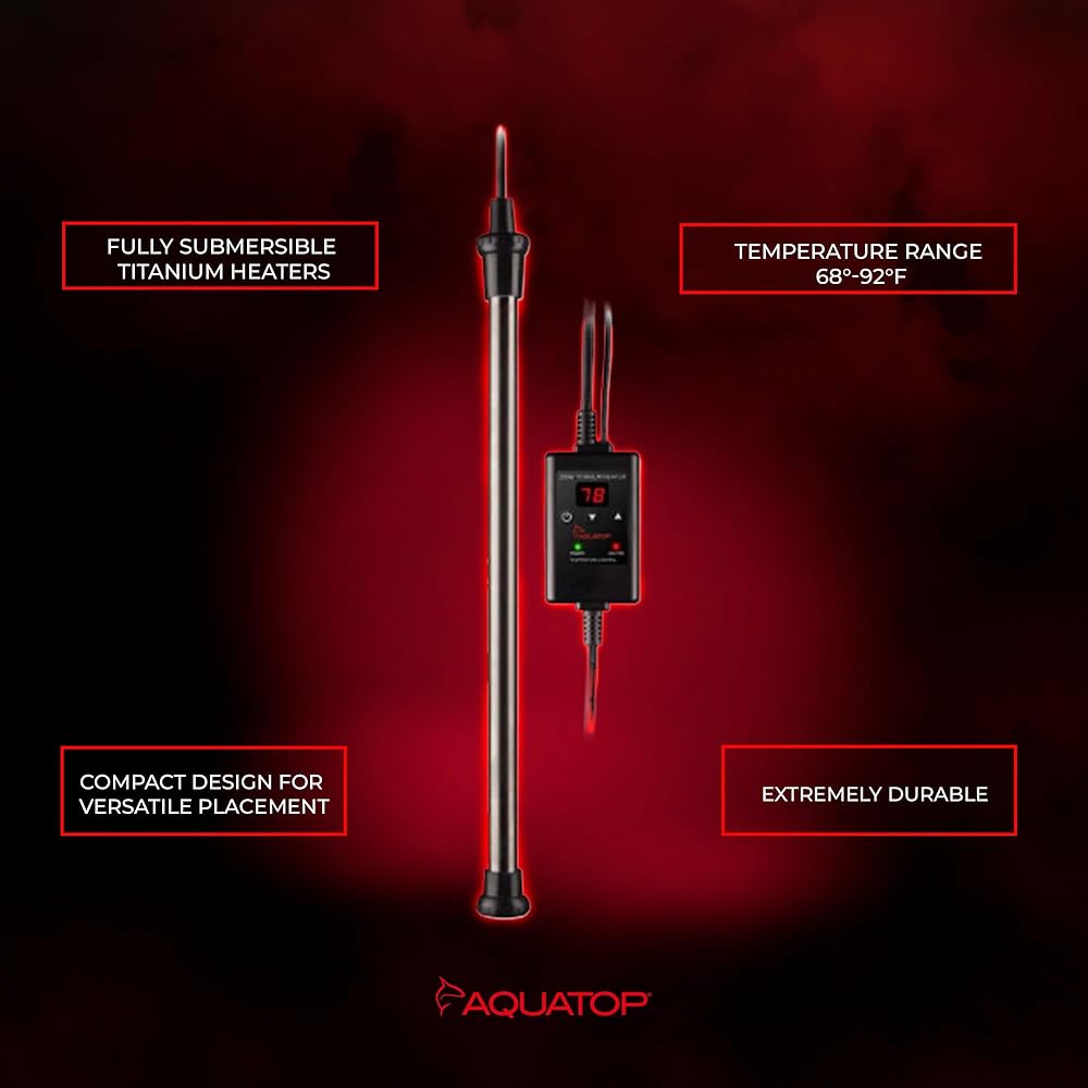 FULLY SUBMERSIBLE AQUARIUM HEATER: Aquatop's TH-C series of fully submersible titanium heaters with controller offers a compact design for versatile placement and a heavy-duty design.