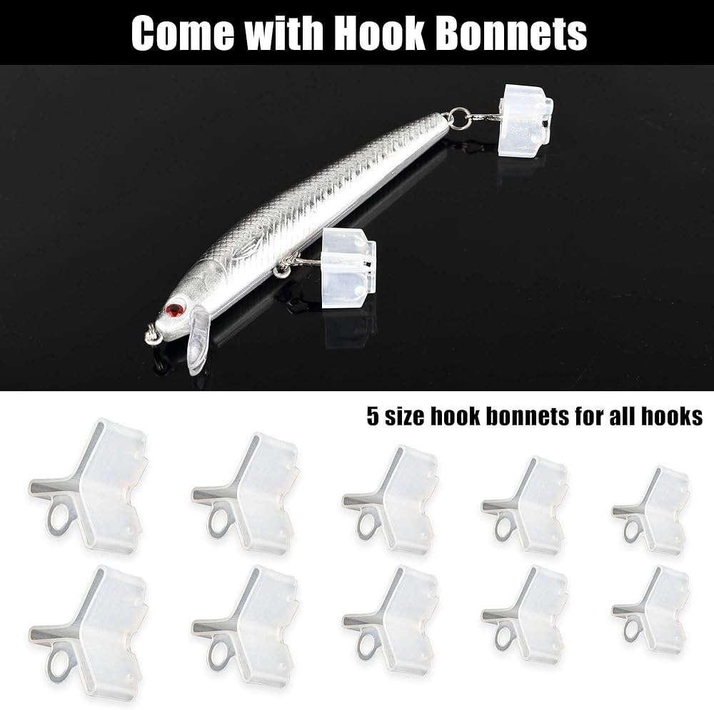 تأتي مع أغطية خطافية: تأتي مع 20 قطعة من أغطية الخطاف (5 مقاسات، 4 قطع/مقاس). تُعد أغطية خطافات الصيد الثلاثية طريقة رائعة لحماية الأصابع من النقاط الحادة للغاية وتبقي الأشياء غير متشابكة في صندوق الأدوات الخاص بك.