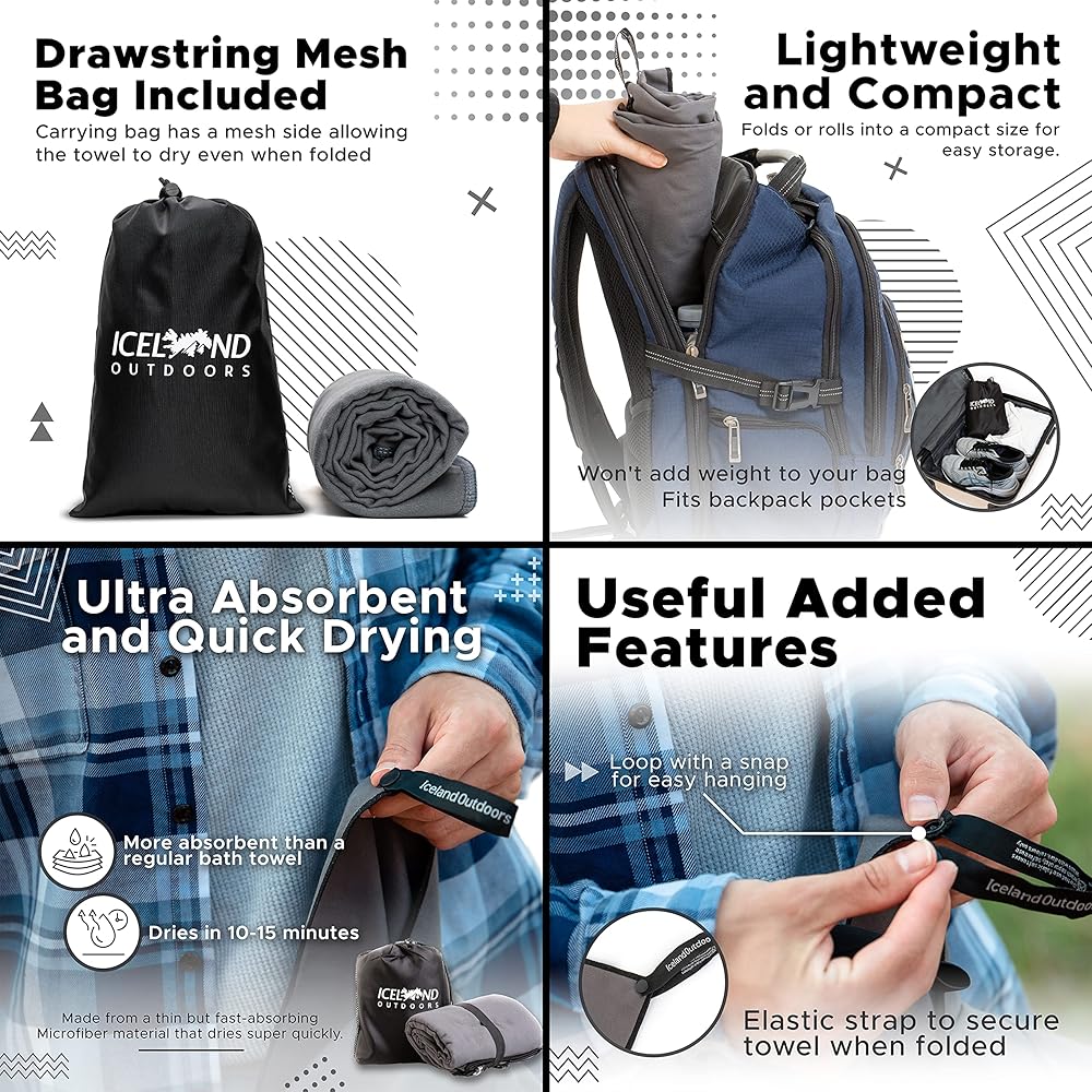 تمتص الماء بسهولة بمقدار 5 أضعاف - بغض النظر عن مدى غمرك بالماء والعرق، فإن مناشف التخييم الجديدة المصنوعة من الألياف الدقيقة سوف تجف بشكل لطيف! لا تنخدع بالملمس الخفيف للغاية - مجموعة مناشف السفر فائقة الامتصاص سريعة الجفاف تعمل بشكل أفضل من المناشف التقليدية لامتصاص الماء. بالإضافة إلى ذلك، فهو صغير الحجم وسهل إحضاره معك إلى صالة الألعاب الرياضية أو التخييم أو الشاطئ أو استخدامه في حمام منزلك. تشتمل هذه المجموعة الفاخرة على منشفتين سريعتي الجفاف للتخييم والسباحة والمزيد!