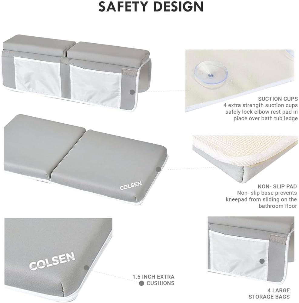 تخزين مريح، ببساطة قم بتوصيل وسادة الركبة بوسادة المرفق على مناطق الفيلكرو المصممة مسبقًا واتركها على حوض الاستحمام أو علقها لتجف باستخدام حلقة التعليق المرفقة. سهلة التنظيف مصنوعة من مادة النيوبرين القابلة للغسل في الغسالة، موادنا عالية الجودة سهلة التنظيف والتطهير عن طريق الغسيل اليدوي أو الغسيل في الغسالة من أجل راحتك. مصنوعة من مادة ناعمة غير سامة بنسبة 100% ومتينة في الوقت نفسه، مجموعة سجادة الحمام هذه أنيقة وسهلة التنظيف والتخزين. بطانة سميكة للغاية بطول 1.4 بوصة بعرض 22 بوصة، هذه البطانة سميكة للغاية عند الحاجة، وتوفر أقصى قدر من الراحة للركبتين والمرفقين. 4 جيوب تخزين كبيرة - جيبان في الأمام و2 في الخلف. الجيوب شبكية لزيادة التخزين وتوفير قدرة أفضل على التجفيف في منزلك. وسادة الركبة ووسادة الكوع مزودة بقاعدة آمنة غير قابلة للانزلاق و4 أكواب شفط لاصقة لإبقائها ثابتة في مكانها.
