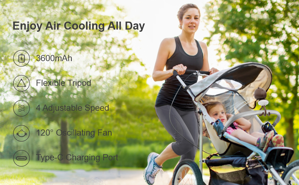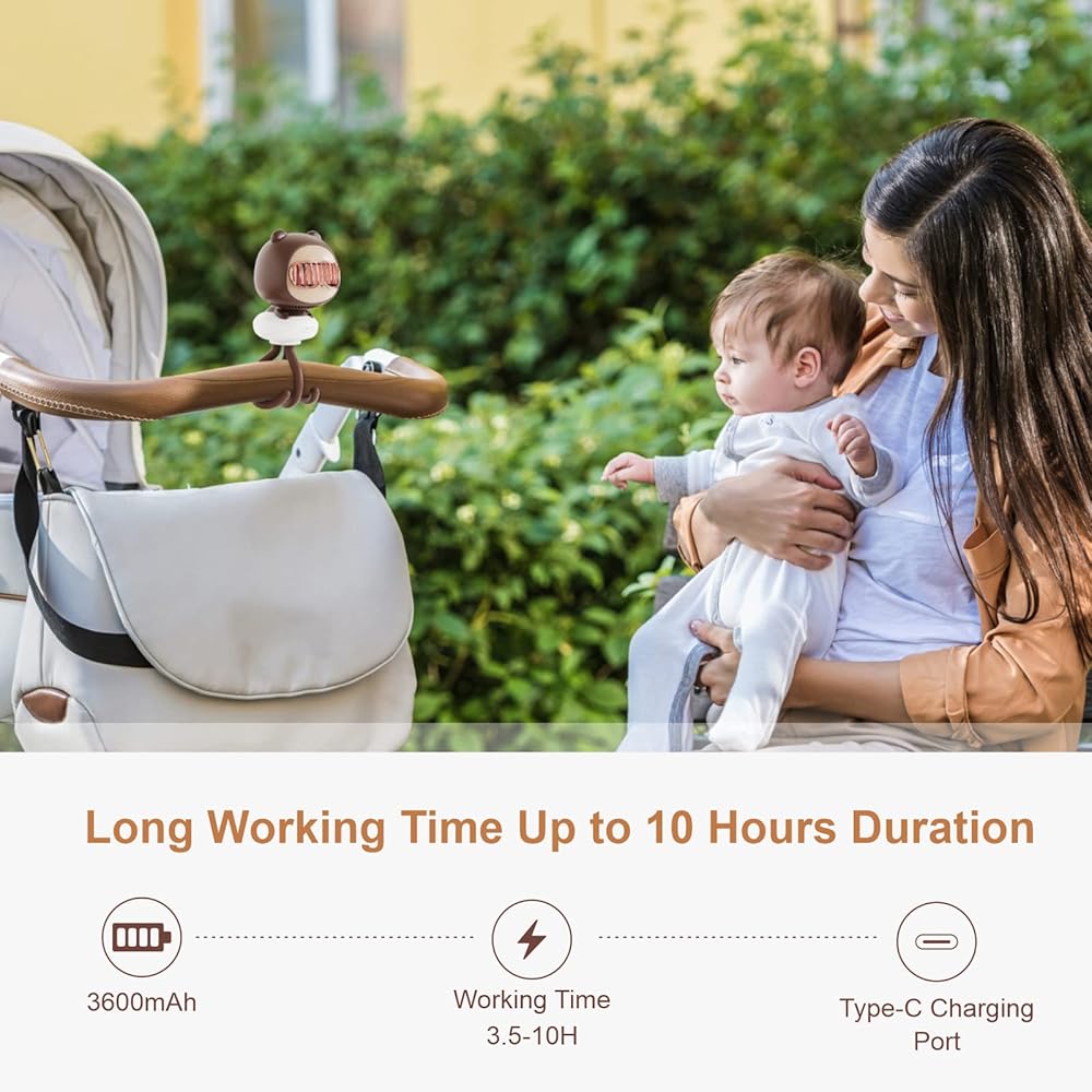 بطارية قابلة لإعادة الشحن: لا تقلق بشأن نفاد البطارية أثناء تواجدك بالخارج - تحتوي مروحتنا الشخصية على بطارية قوية بقوة 3600 مللي أمبير في الساعة تدوم طويلاً من 3.5 إلى 10 ساعات؛ استعدي للاستمتاع بنزهات خالية من التوتر مع طفلك، بفضل مروحتنا الرائعة القابلة لإعادة الشحن عبر USB