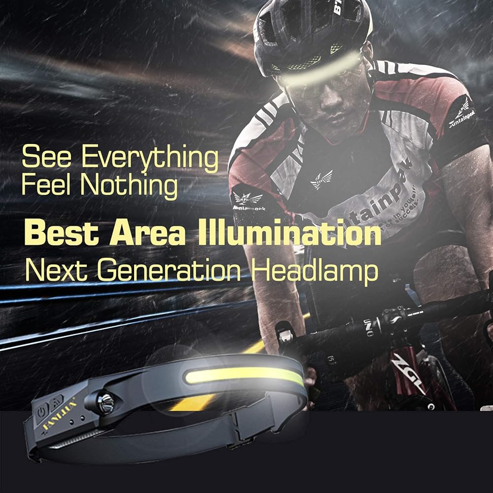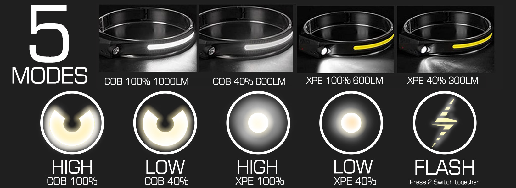 • تشغيل متعدد الاستخدامات بـ 5 أوضاع وتحريض مموج: يتميز مصباح الرأس بمفتاح 5 أوضاع سهل الاستخدام؛ COB 100% / COB 40% / XPE 100% / XPE 40% / فلاش. مدعوم من COB الذي يوفر 350 لومن في الإعداد العالي للحصول على أقصى قدر من الإضاءة. مصباح الرأس مزود بمستشعر حث مموج جانبي وإبزيم بلمسة واحدة، سهل العمل في الهواء الطلق عند ارتداء هذا المصباح الأمامي