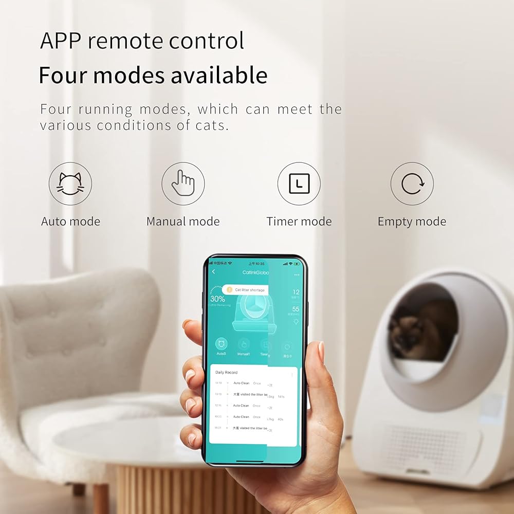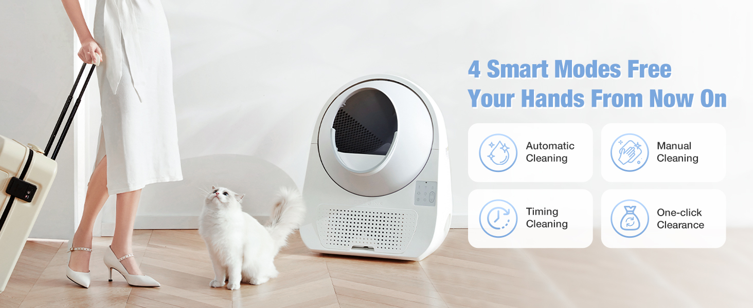 𝟰 𝗖𝗹𝗲𝗮𝗻 𝗠𝗼𝗱𝗲𝘀: يتوفر الوضع التلقائي، والوضع اليدوي، ووضع المؤقت، والوضع الفارغ مع التحكم في التطبيق عن بعد أو التحكم في اللوحة. بالإضافة إلى ذلك، فإن الوضع الفارغ مناسب لتغيير جميع فضلات القطط وتنظيف الكرة الأرضية.