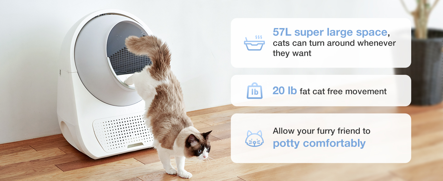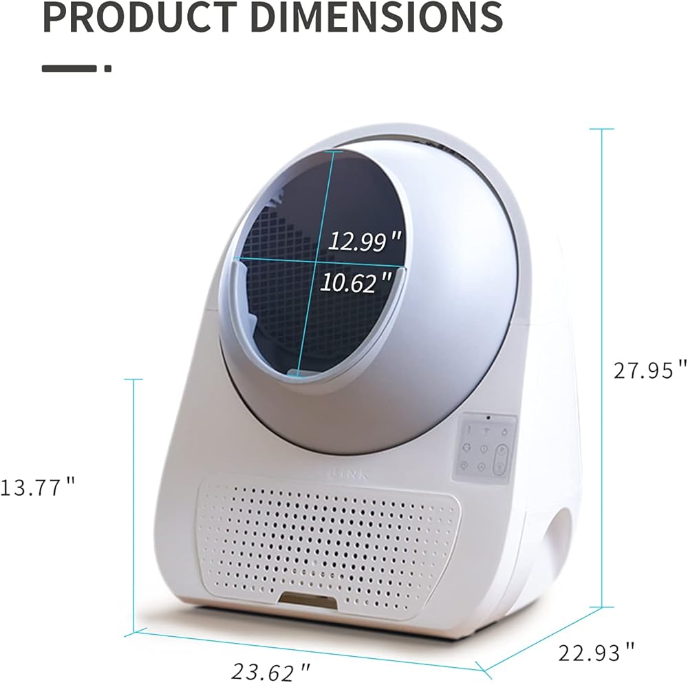 𝗦𝗶𝘇𝗲: يبلغ حجم صندوق القمامة الأوتوماتيكي 23.6 × 22.9 × 27.9 بوصة ويبلغ سعته الأرضية 57 لترًا وسعة درج النفايات 13 لترًا. إنه مناسب للقطط التي يتراوح وزنها بين 3.3 رطل إلى 22 رطل، لكن لا يُنصح به للقطط ذات الوزن المنخفض.