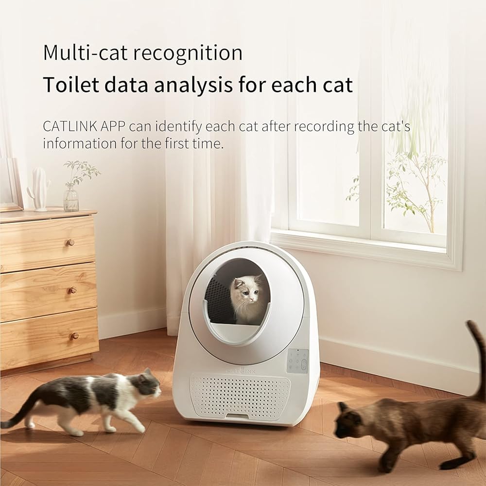 𝗠𝘂𝗹𝘁𝗶-𝗖𝗮𝘁 𝗙𝗮𝗺𝗶𝗹𝘆: يمكن للتنظيف الذاتي لصندوق فضلات القطط اكتشاف القطط المختلفة والتعرف عليها، وتسجيل استخدام المرحاض لكل قطة. باستخدام تطبيق Catlink، يمكن لأصحاب القطط تتبع وزن كل قطة والبقاء على اطلاع على صحة قطتهم.