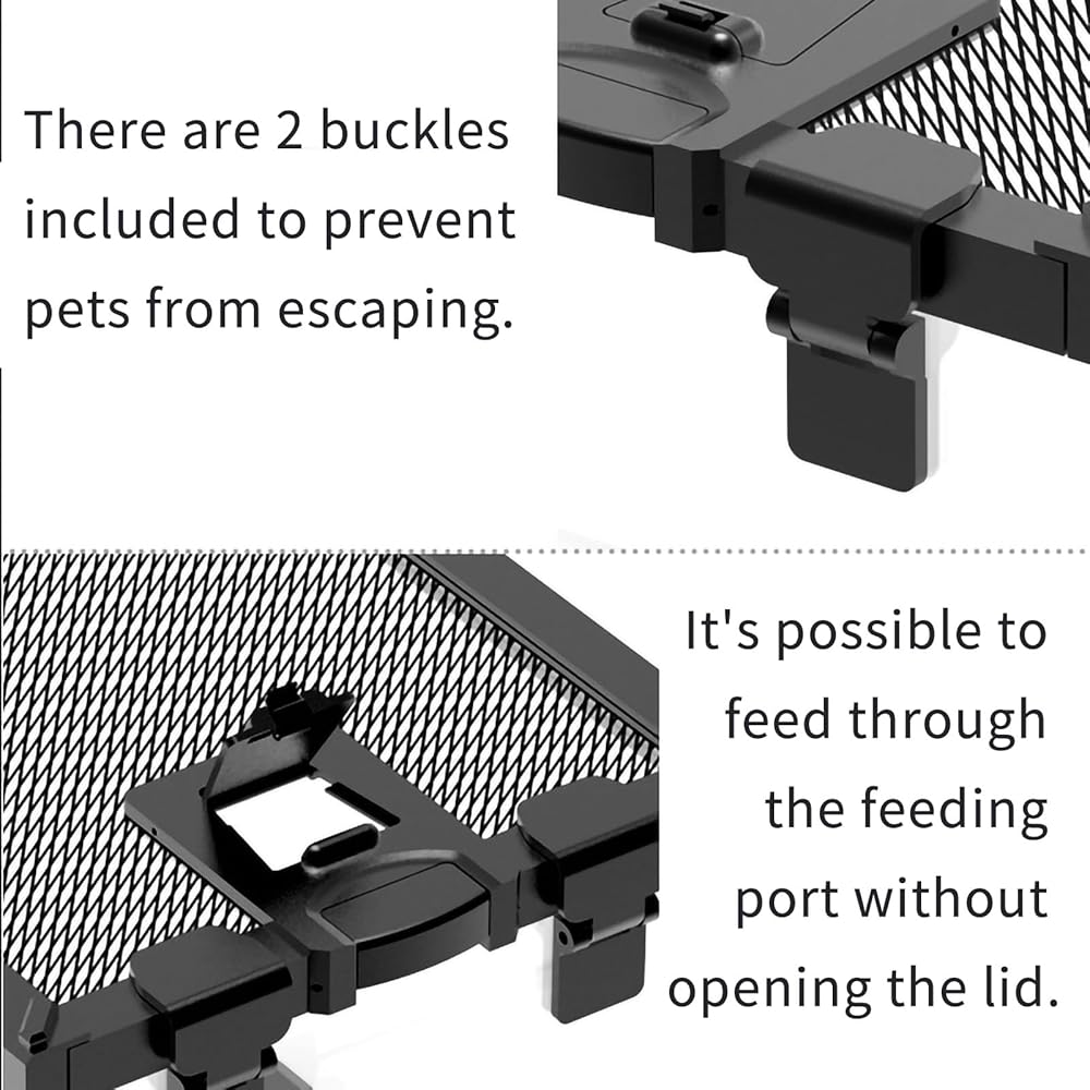 【قفل آمن】يحتوي الغطاء العلوي لحاوية الزواحف على قفل أمان، والذي يمكن أن يمنع الحيوانات الأليفة من الهروب. هذا مقياس أمان للحفاظ على الحيوانات الأليفة في الحاوية الزجاجية. الغطاء مجهز بمنفذ تغذية مصمم خصيصًا لإطعام الحيوانات الأليفة بشكل مريح.