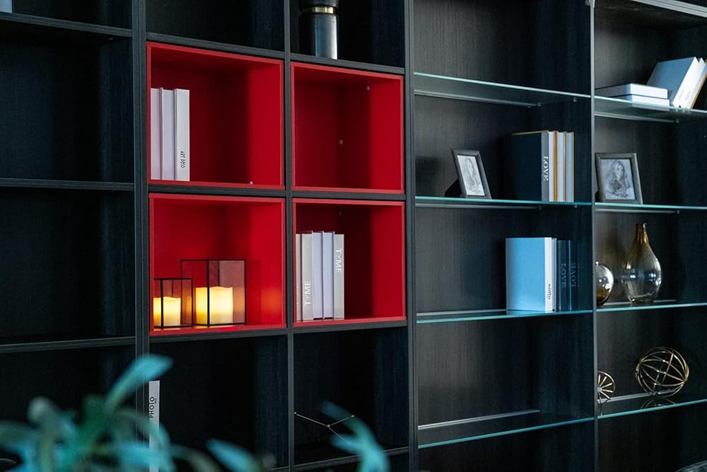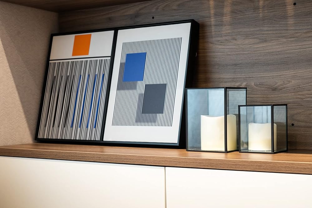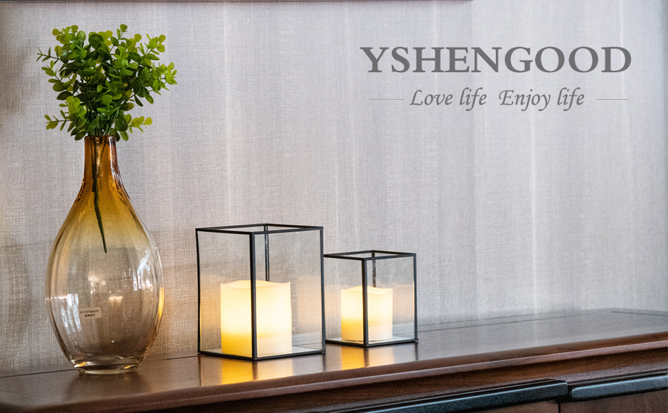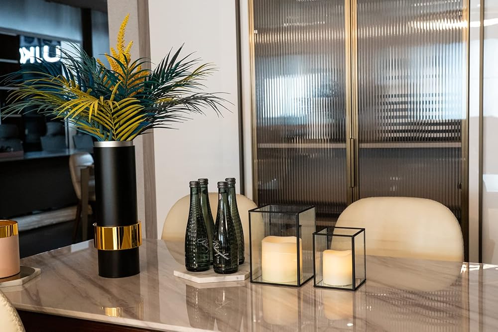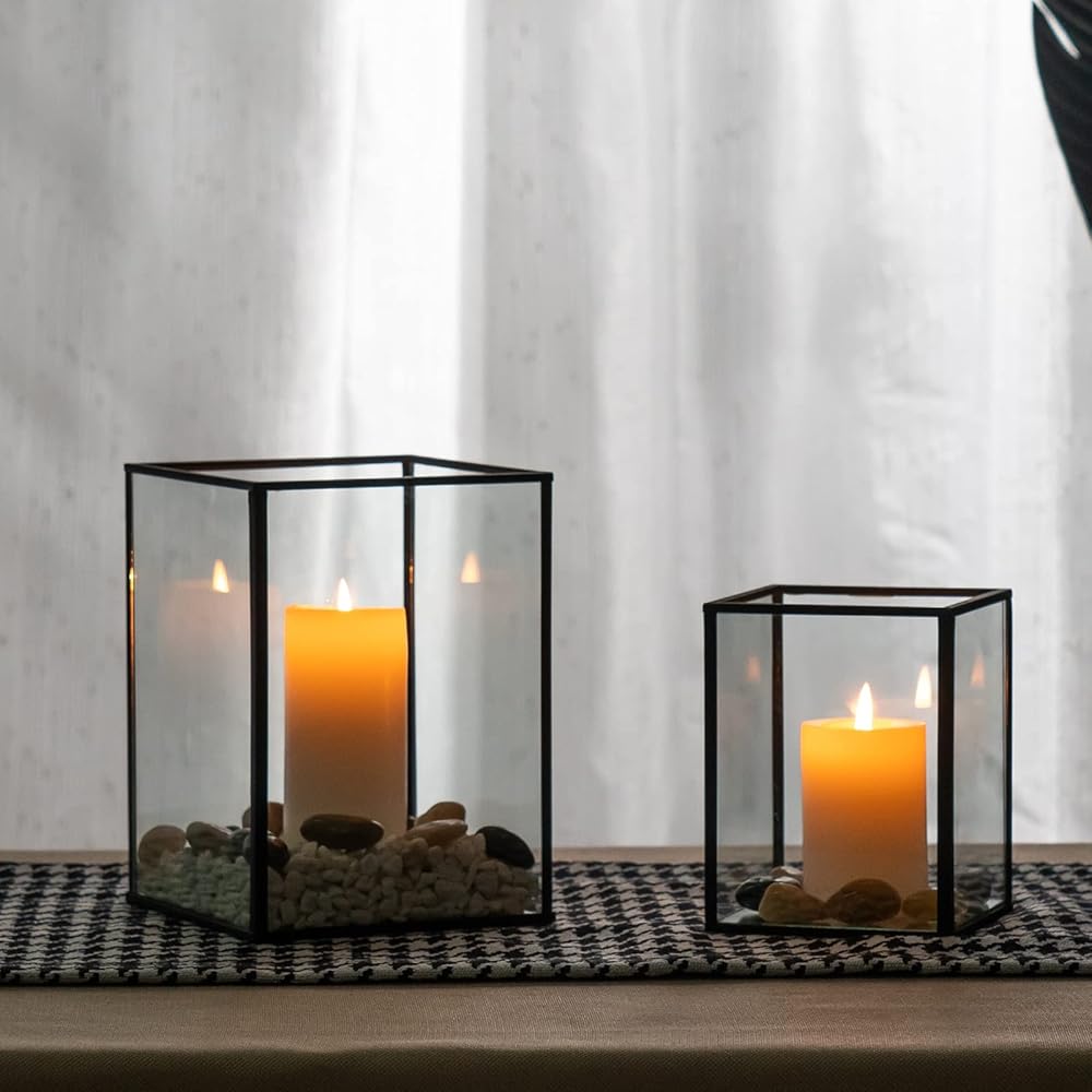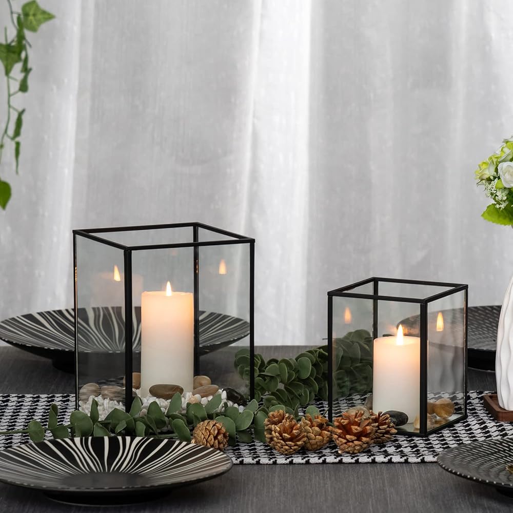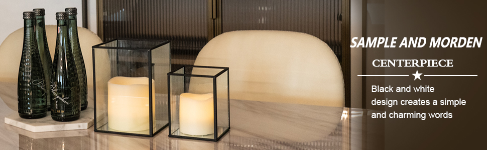 • 【تصميم بسيط وأنيق】- حامل الشموع الزجاجي مصنوع من إطار معدني أسود وزجاج شفاف،