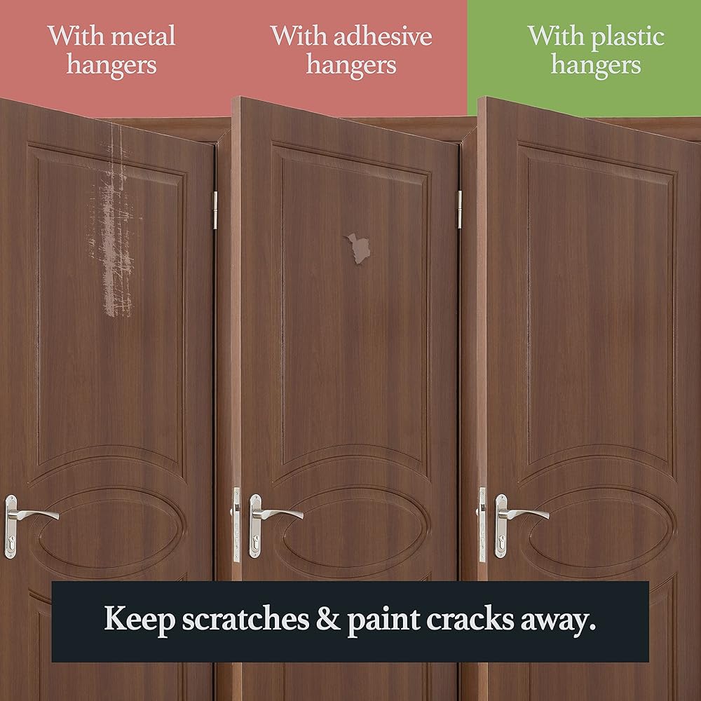 خالية من الخدوش: قم بحماية بابك الأمامي أو أي سطح آخر من التلف باستخدام شماعات الإكليل الرفيعة وخفيفة الوزن. لن تشغل خطافات الإكليل الناعمة الخاصة بنا مساحة كبيرة ولن تتلف أو تخدش أي سطح، لذلك ستكون قادرًا على تعليق إكليلك بثقة مع العلم أن بابك آمن ومأمون.