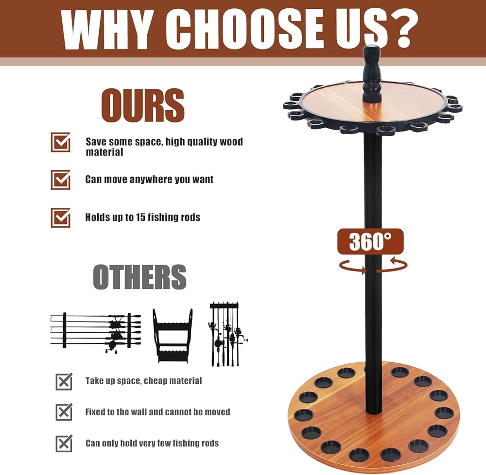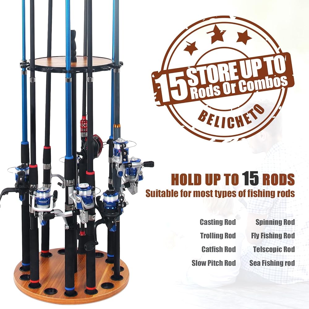 حامل قضيب الصيد العمودي من belicheto، رف قضيب الصيد يدور 360 درجة، رفوف أرضية تخزين عمود الصيد الخشبية المستديرة، يحمل 15 صنارة صيد