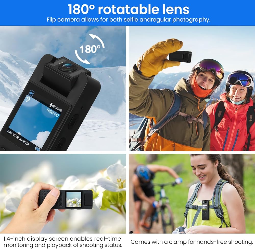 • 【عدسة قابلة للدوران بزاوية 180 درجة ومشبك خلفي قوي】مجهزة بعدسة فريدة قابلة للدوران يدويًا بزاوية 180 درجة، سوف ترى دائمًا اللقطات المسجلة في الوقت الحقيقي، بغض النظر عن مكان تشغيل العدسة. مشبك خلفي جديد مطور، قوي جدًا وليس من السهل ارتخاؤه.