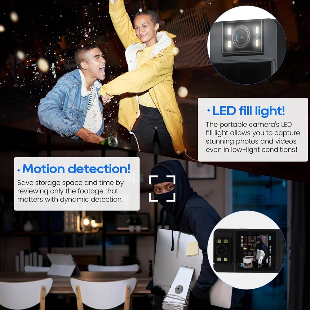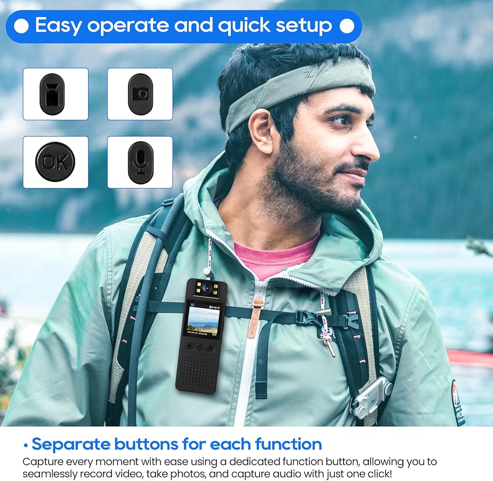 • 【زر واحد لتسجيل فيديو/صورة بدقة 1080 بكسل بسرعة】توجد أزرار تشغيل مستقلة واضحة وبارزة نسبيًا على جانب كاميرا الجسم، تحتاج فقط إلى الضغط على الزر في حالة مفتاح الطاقة لتسجيل الفيديو أو التقاط الصور بسرعة، وهو سيتم حفظه تلقائيًا. ملاحظات: هذا جهاز للفيديو فقط ولا يحتوي على وظيفة الصوت.