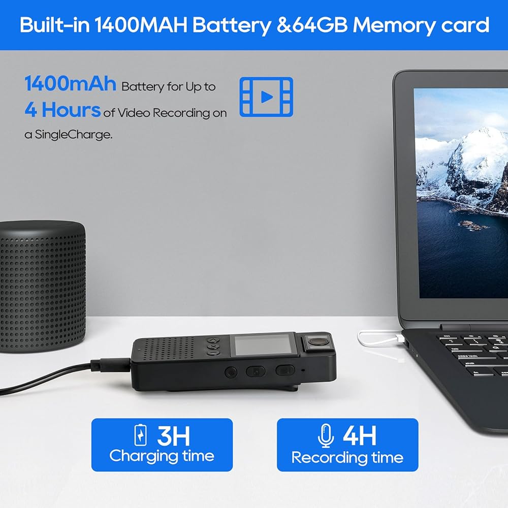 • 【مع بطاقة TF سعة 64 جيجابايت وبطارية قابلة لإعادة الشحن تدوم 4 ساعات】 تأتي كاميرا الجسم هذه مع بطاقة ذاكرة ممتازة سعة 64 جيجابايت (ملاحظة: إنها تدعم فقط بطاقة TF المتميزة من 4 إلى 256 جيجابايت بتنسيق FAT32). مدعوم ببطارية ليثيوم قابلة لإعادة الشحن، بعد 3 ساعات من الشحن الكامل، يمكنك تحقيق 4 ساعات من تسجيل الفيديو.