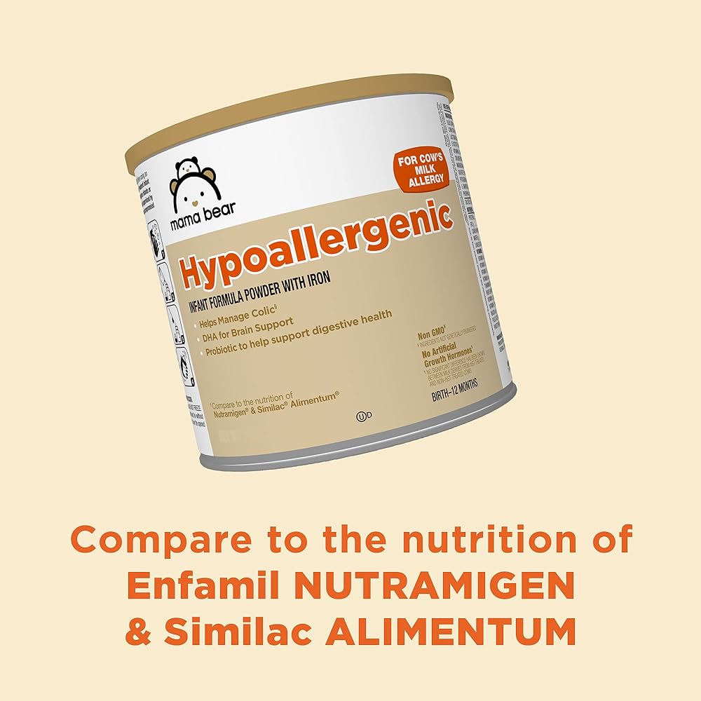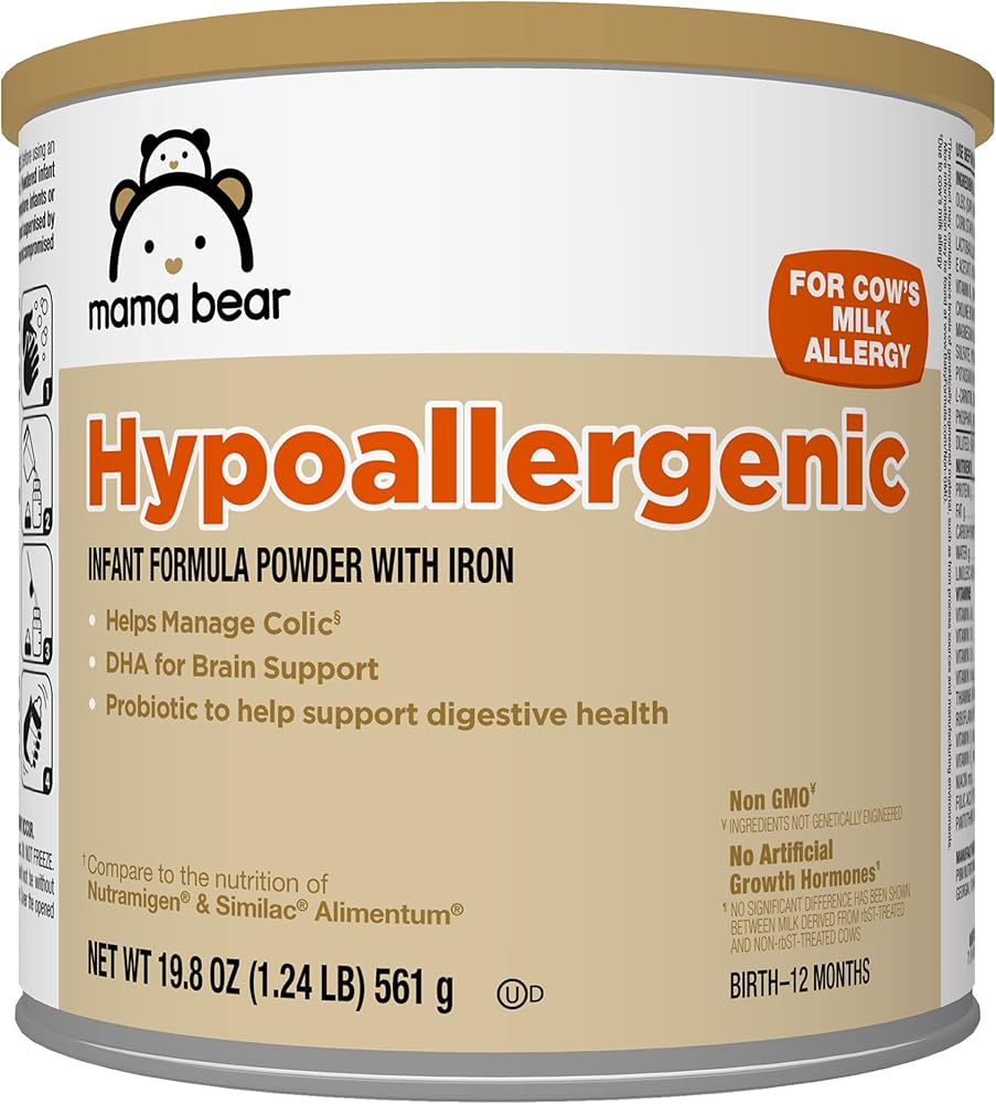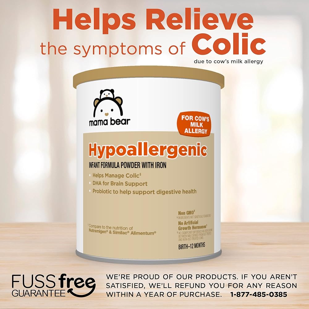 • MANAGE COLIC: Mama Bear Hypoallergenic baby formula, clinically studied for colic due to cow's milk allergy; compare to the nutrition of Nutramigen and Similac Alimentum