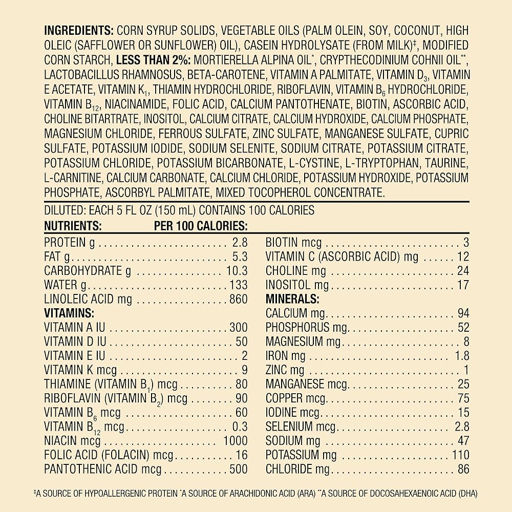 Compare to the nutrition of Nutramigen and Similac Alimentum. Mama Bear Hypoallergenic Infant Formula Powder with Iron is clinically studied for cow's milk allergy. Proteins are broken into small pieces to make this hypoallergenic baby formula easier for baby to digest. With a probiotic to help support digestive health. DHA for brain support. Complete nutrition through 12 months. This product differs in appearance and taste compared to milk-based or soy-based formulas. It may separate when chilled. Simply shake well prior to feeding. Non-GMO ingredients: not genetically engineered. No artificial growth hormones: No significant difference has been shown between milk derived from rbST-treated and non-rbST-treated cows. Similac and Alimentum are registered trademarks of Abbott Laboratories. Nutramigen is a registered trademark of Mead Johnson & Co. Mama Bear Hypoallergenic Infant Formula is NOT made by or affiliated with Abbott Laboratories or Mead Johnson & Co. Mama Bear Hypoallergenic Infant Formula does not contain the identical proprietary ingredient blend of prebiotics, patented levels of nucleotides, lutein and lycopene in Similac Alimentum. The product may contain trace levels of genetically engineered material, such as from process sources and manufacturing environments.