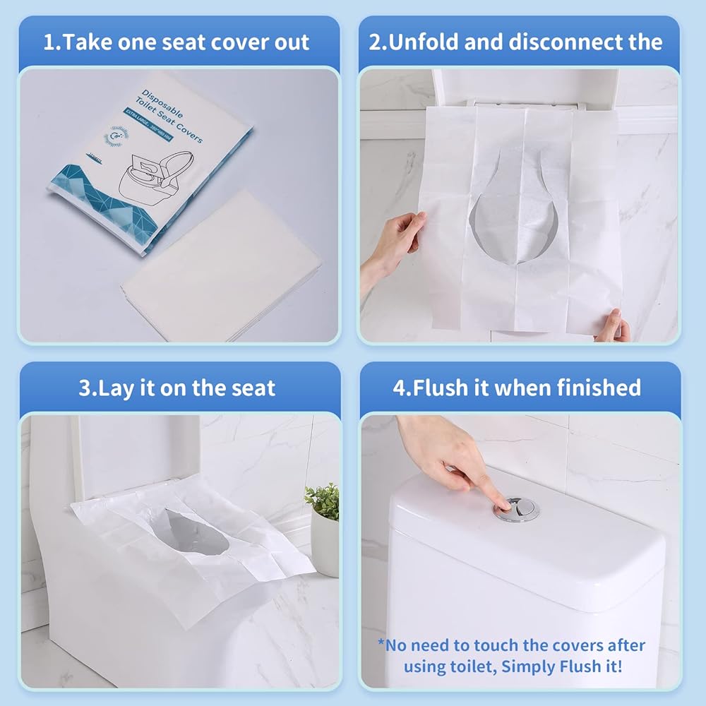 【Recyclable and Flushable】This toilet seat covers disposable are made of 100% thick virgin wood pulp, an environmentally safe material that easily dissolves in water and won't clog the drains after you flush it.