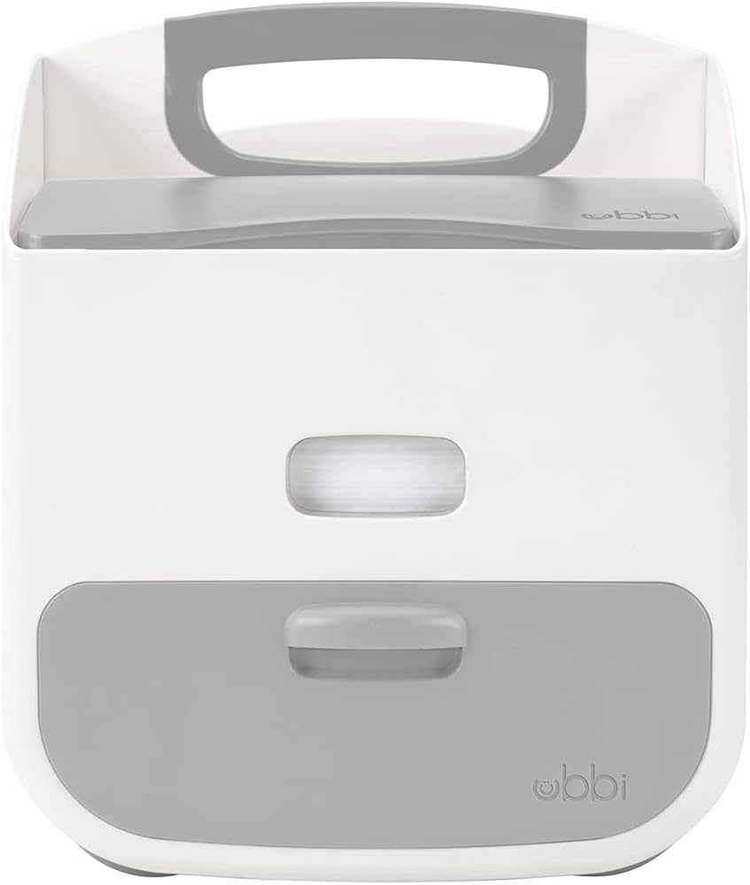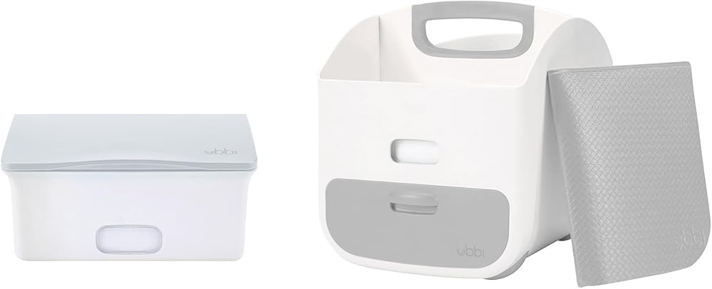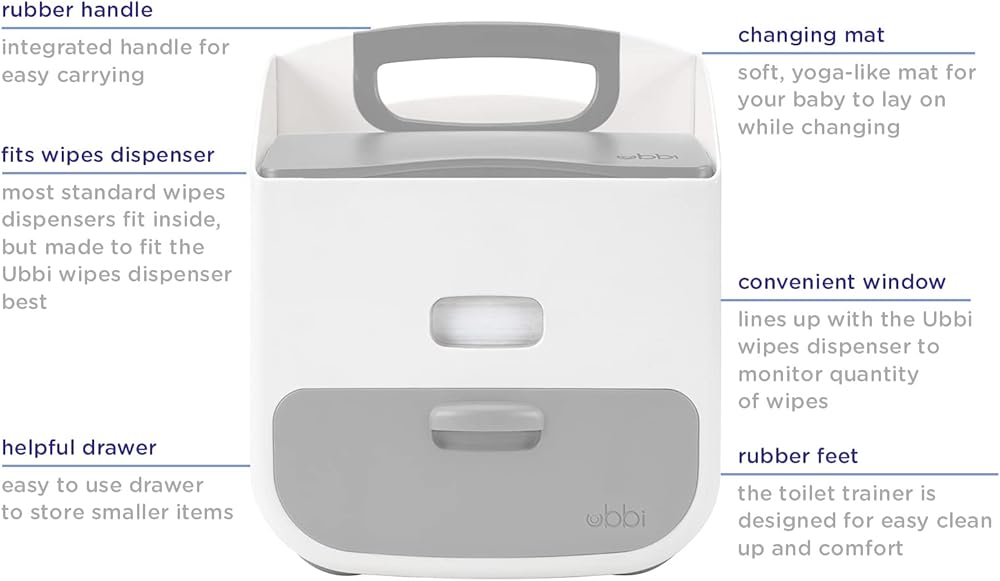 The Ubbi Diaper Storage Caddy and Changing Mat provides parents with convenience, durability and accessibility by having all the diapering supplies organized in one portable storing unit. Made of sturdy plastic, the Ubbi diaper caddy has two main compartments for diapers and wipes, with a drawer for smaller items and a fitted space that includes a comfortable and easy-to-clean changing mat. The caddy also has an integrated handle and non-skid rubber feet allowing it to be carried around or stay safely in one place. While the Ubbi diaper caddy can store most disposable wipes dispensers, it was cleverly designed with a window that matches the Ubbi branded wipes dispenser's window for parents to know when they are running low on wipes. PVC, BPA & Phthalate free. Ubbi wipes dispenser sold separately.