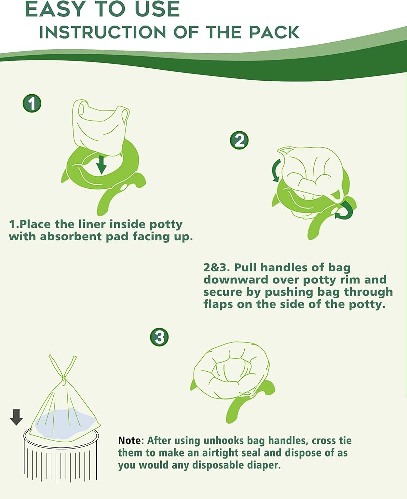 • 【Absorbent and Leak Proof potty chair liners toddler】: potty training liners disposable are 0.71 mils thick per layer, which means leaks and tears are prevented. The stay put absorbent pads easily soak up up to 5 ounces of liquid, quickly locking in the mess. Avoid any spills and odors for your little one when using the potty independently!