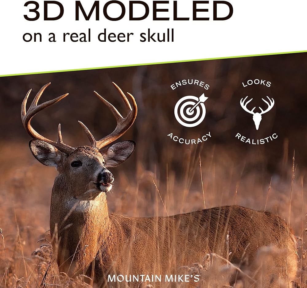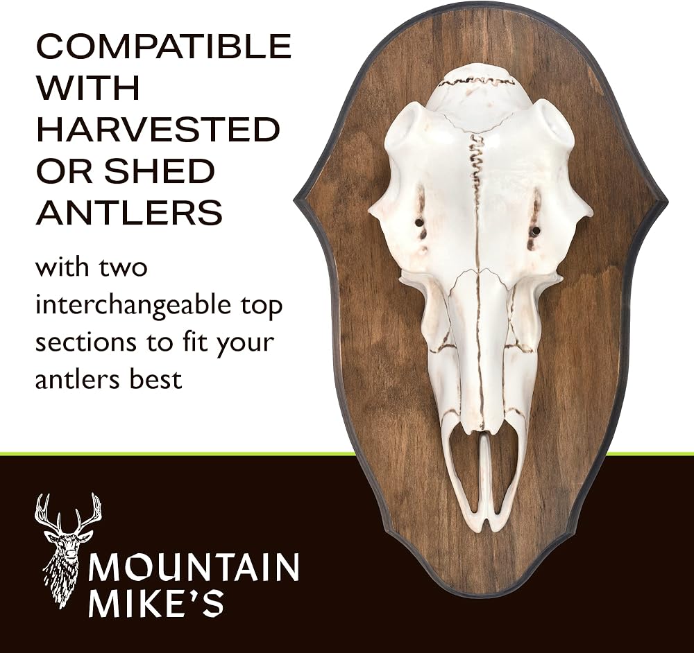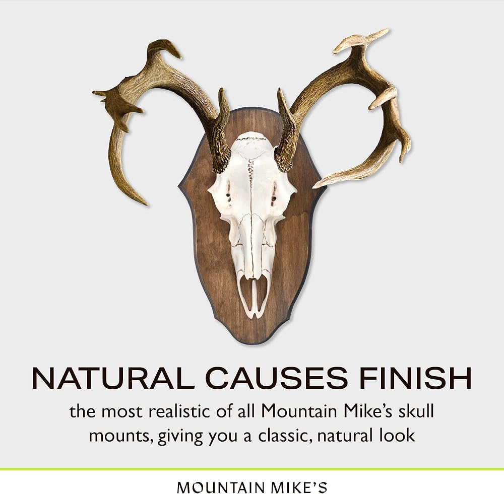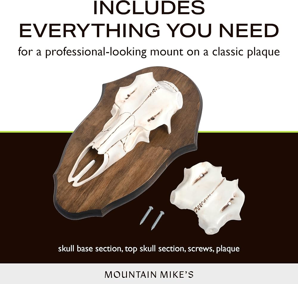نصف جمجمة على الطراز التقليدي مع لوحة من الغابة السوداء في ألمانيا. متوافق مع مجموعة قرون القرون التي تم حصادها أو مجموعة قرون السقيفة وتتضمن قسمين علويين مختلفين الحجم وجميع الأجهزة اللازمة لربط مجموعة من القرون للحصول على حامل جمجمة غزال أوروبي تقليدي رائع المظهر. مجموعة الغابة السوداء الجديدة "Natural Causes" من ماونتين مايكس ريبرودكشن هي الجمجمة الأكثر أصالة في السوق
