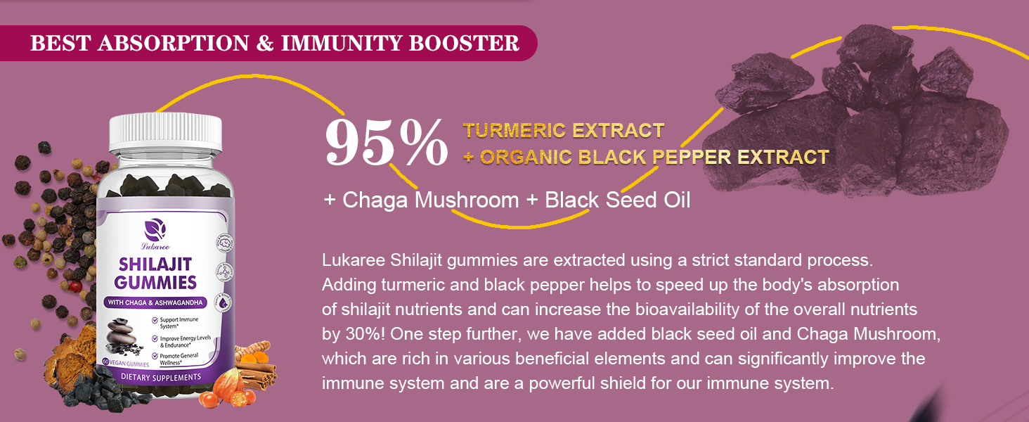 • أفضل امتصاص وتوافر بيولوجي: تساعد المركبات النشطة بيولوجيًا المضافة في الفلفل الأسود على زيادة كفاءة امتصاص الجسم للمكونات الأخرى، مما يجعل العديد من العناصر الغذائية في علكات شيلاجيت أسهل في الامتصاص والاستخدام. بالإضافة إلى ذلك، يعمل الكركم والزنجبيل معًا لإنتاج فوائد أكبر. إن التحكم بصحتك العامة هو عملية بسيطة وسريعة بمساعدة شيلاجيت من جبال الهيمالايا!*