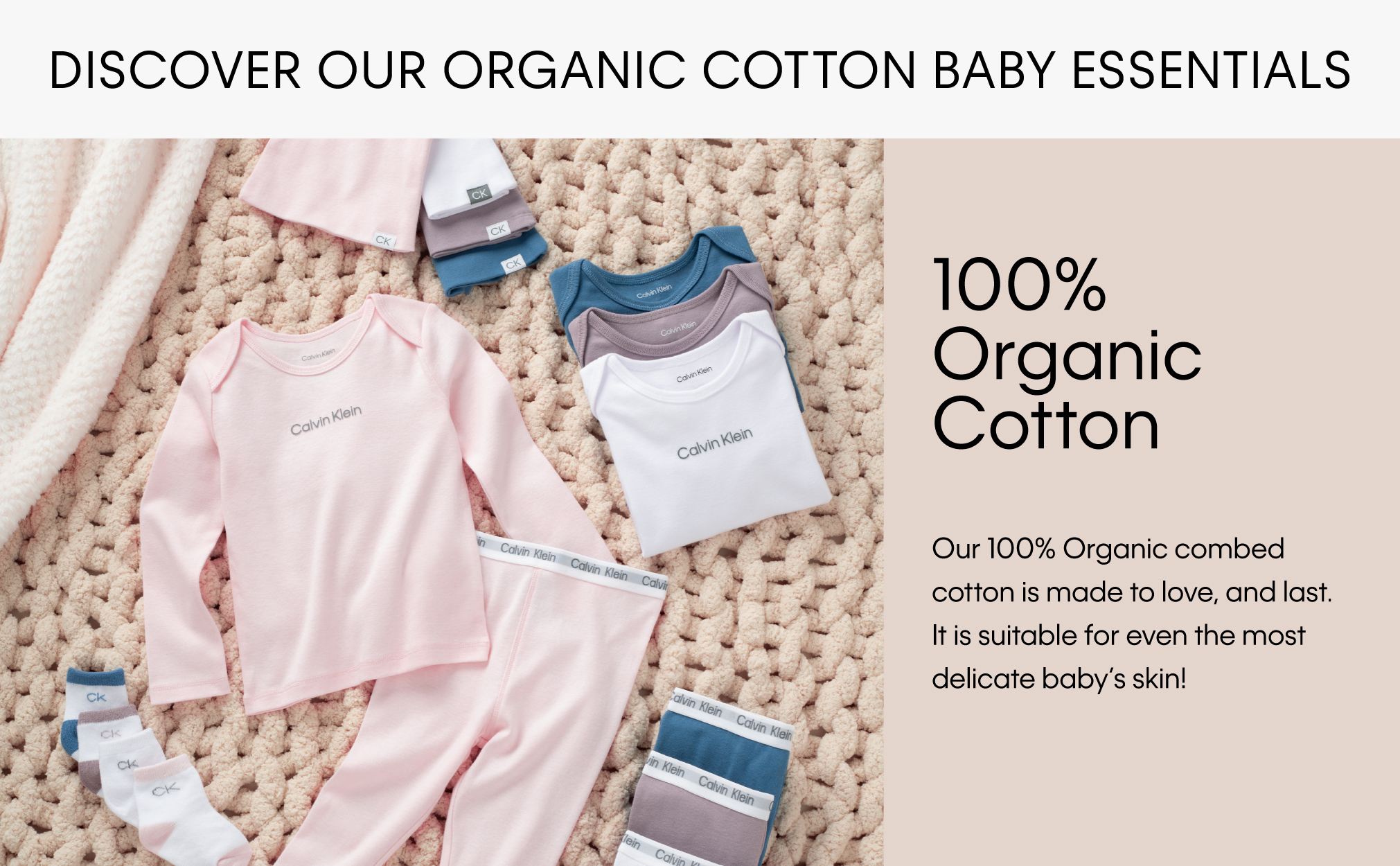 Organic has never been so cute and cozy! Have your little ones sleep and play in utter comfort while helping to safeguard the world they live in. Sow the seeds of a more sustainable future by choosing Calvin Klein Baby Essentials as your go-to for everyday casual wear, lounging, or active play. Founded in New York in 1968 and recognized worldwide as a premium fashion lifestyle brand, Calvin Klein elevates everyday essentials to globally iconic status. Our modern and minimalist approach to design, and authentic connection to culture has resonated across generations for over 50 years.