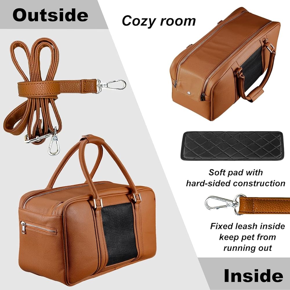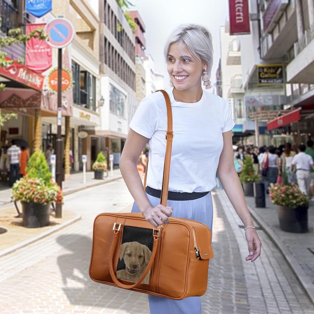 NewEle Fashion Dog Purse Carrier للكلاب الصغيرة مع 2 جيوب إضافية، يحمل ما يصل إلى 10 رطل من جلد البولي يوريثان حامل الحيوانات الأليفة، حامل القطط، حامل جرو معتمد من شركة الطيران للسفر (بني، حجم صغير)