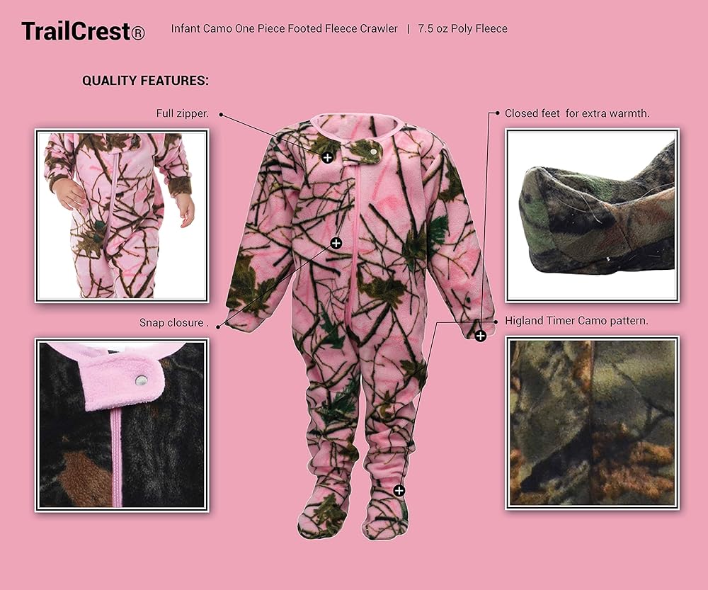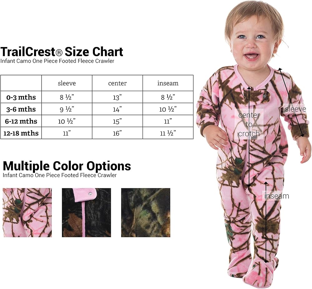 When the weather turns a bit chilly, there's nothing better than this cozy sleeper for your little one. The camo pattern makes this outfit as fun as it is functional! What's easier than this grab-and-go fleece sleeper? Classic styling, easy fit and soft fleece make this top an all season winner! Cozy fleece sleeper Full front zipper for easy on and off Realistic camo print for the youngest hunters Contrasted with bright neon color for a sporty look. Super comfortable camo sleeper. Great for the Little Hunter!!