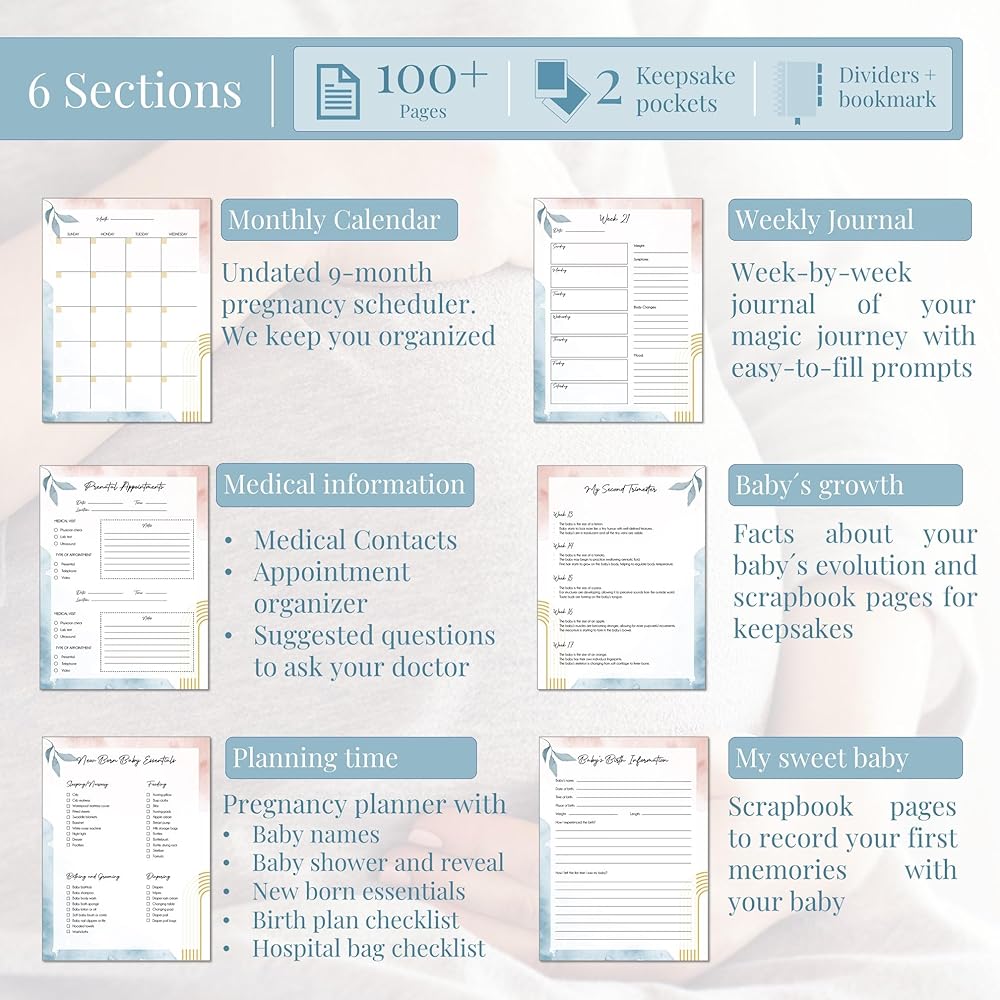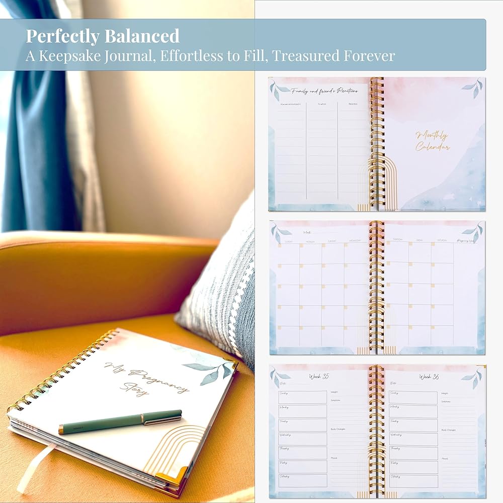 Discover six thoughtfully curated sections within its pages, including a free-form journal, pregnancy planner and a memory book with guided content tailored to support expectant mothers at every stage. From helpful checklists and prompts to FAQs for navigating doctor's appointments, gender reveals, baby showers, and more, it's an invaluable companion. The journal also features a standard monthly calendar adaptable to any year, perfect for 2023 and 2024 planning, alongside a weekly journal section with easy-to-fill prompts for capturing every meaningful moment.
